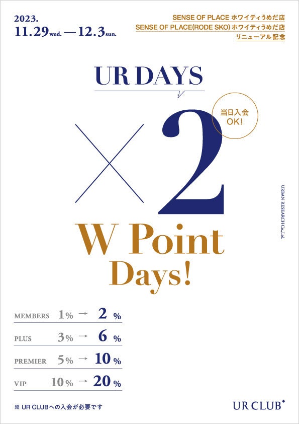 2023年11月29日(水)から12月3日(日)の期間中にSENSE OF PLACE by URBAN RESEARCH ホワイティうめだ店でお買い物いただくと、UR CLUBポイントを通常の2倍で還元!