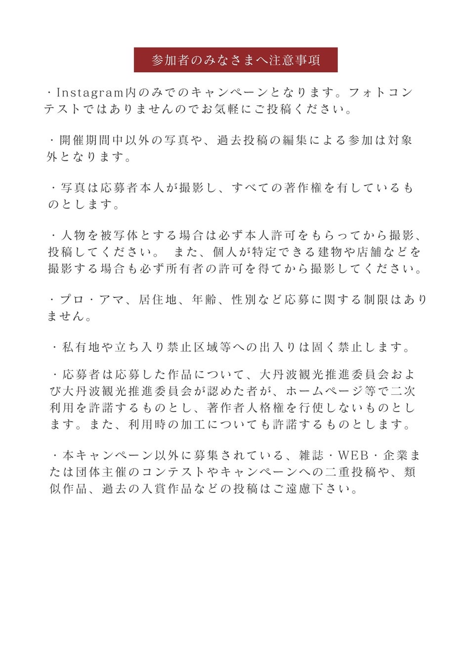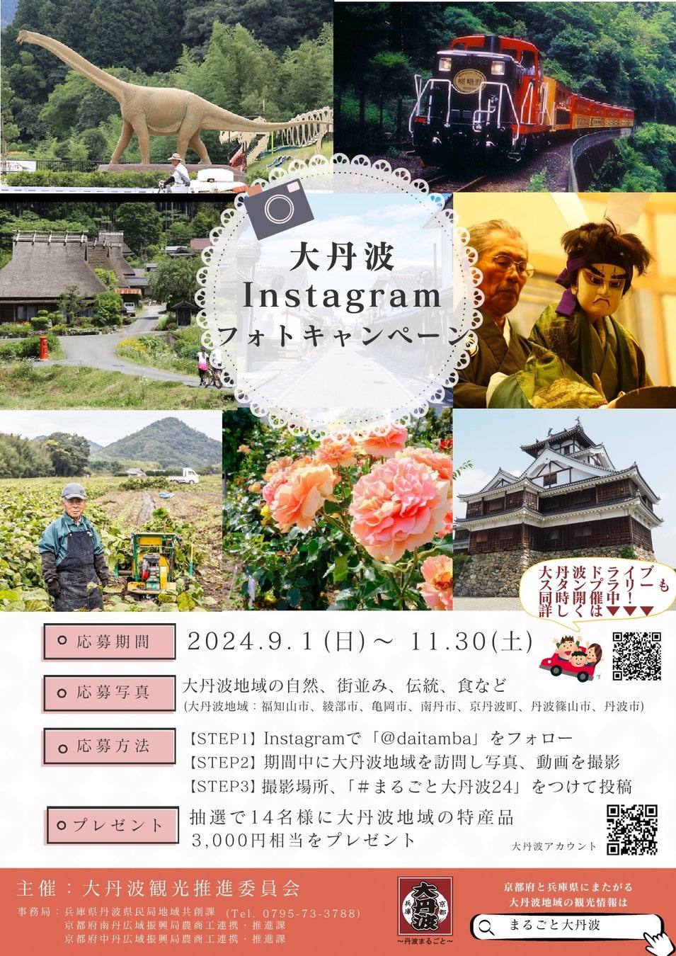 ■大丹波ドライブスタンプラリー(令和6年9月~11月)の実施に合わせ、大丹波地域への来訪促進を図るとともに、大丹波地域の魅力を広く発信するため、大丹波地域の自然、街並み、伝統、食などを撮影した写真や動画を広報力のあるInstagramに投稿してもらうフォトキャンペーンを開催します。
