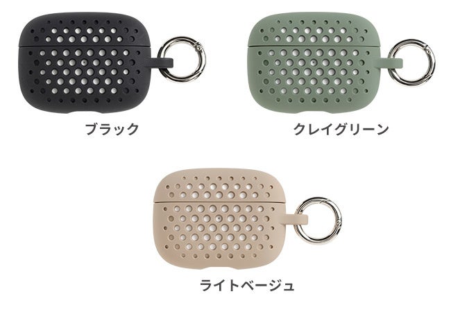 カラーは、シンプルで洗練された印象の「ブラック」、くすんだグリーンがおしゃれな印象でブランドの定番カラーである「クレイグリーン」、ユニセックスで楽しめる「ライトベージュ」の3色展開です。グリップ感を高めるTPU素材で、柔らかくサラサラとした触り心地。ケースをつけたままワイヤレス充電が可能なほか、バッグやベルトに取り付けられるカラビナ付きです。また、メッシュ穴から充電ランプが見えることで、充電状態を確認しやすい設計となっています。