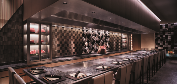 「ひのきざか 鉄板焼」では、日本各地から選りすぐった和牛を、鉄板焼ならではの技法で調理、素材のおいしさを最大限に活かした料理をお楽しみいただけます。店内はガラス製の“蹲踞(つくばい)”、 アルミ仕上げのタイルで構成された壁面など、モダンなデザインの内装が施された、ごゆっくりおくつろぎいただける空間で、こころゆくまで上質なダイニング・エクスペリエンスをご堪能ください。