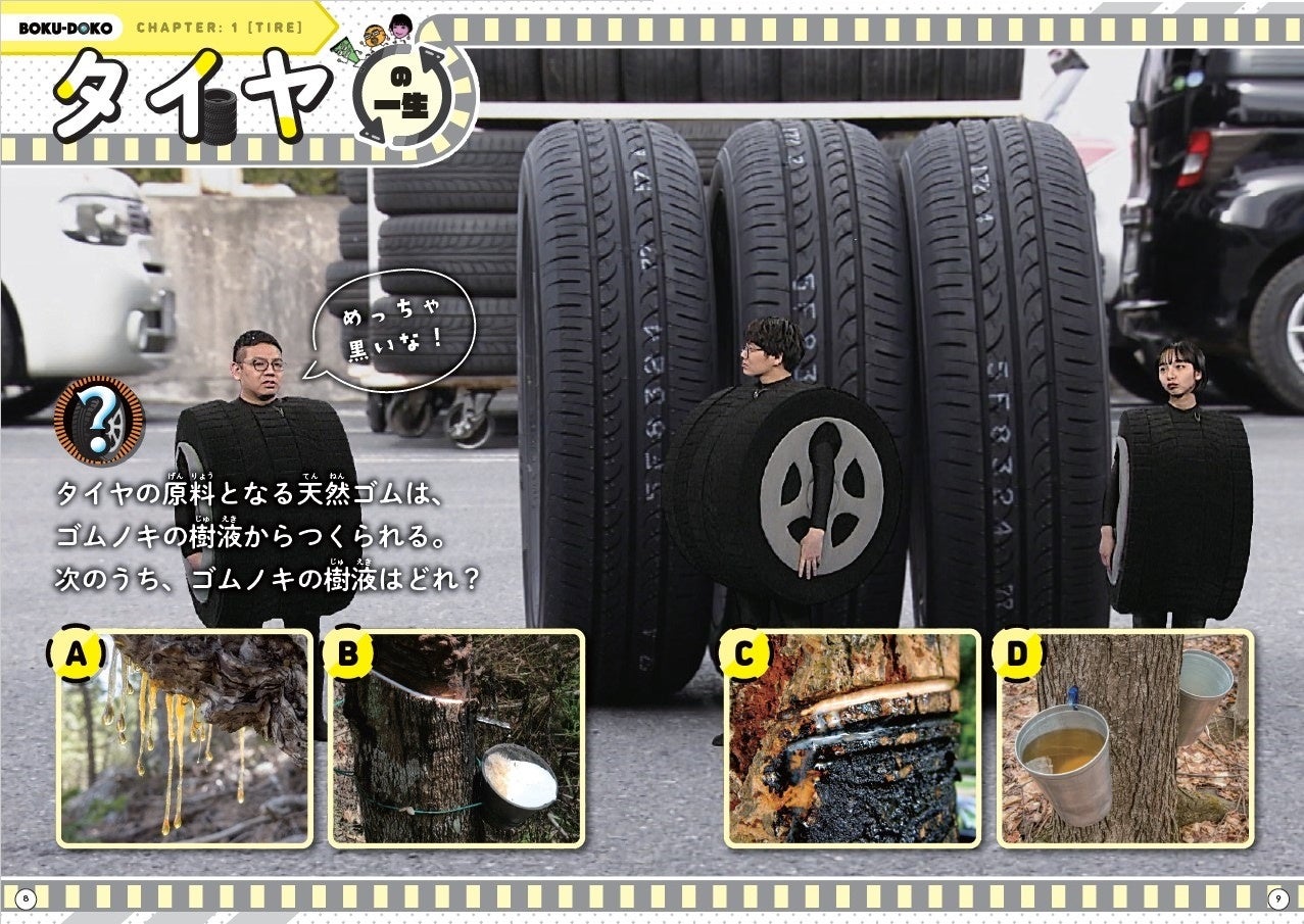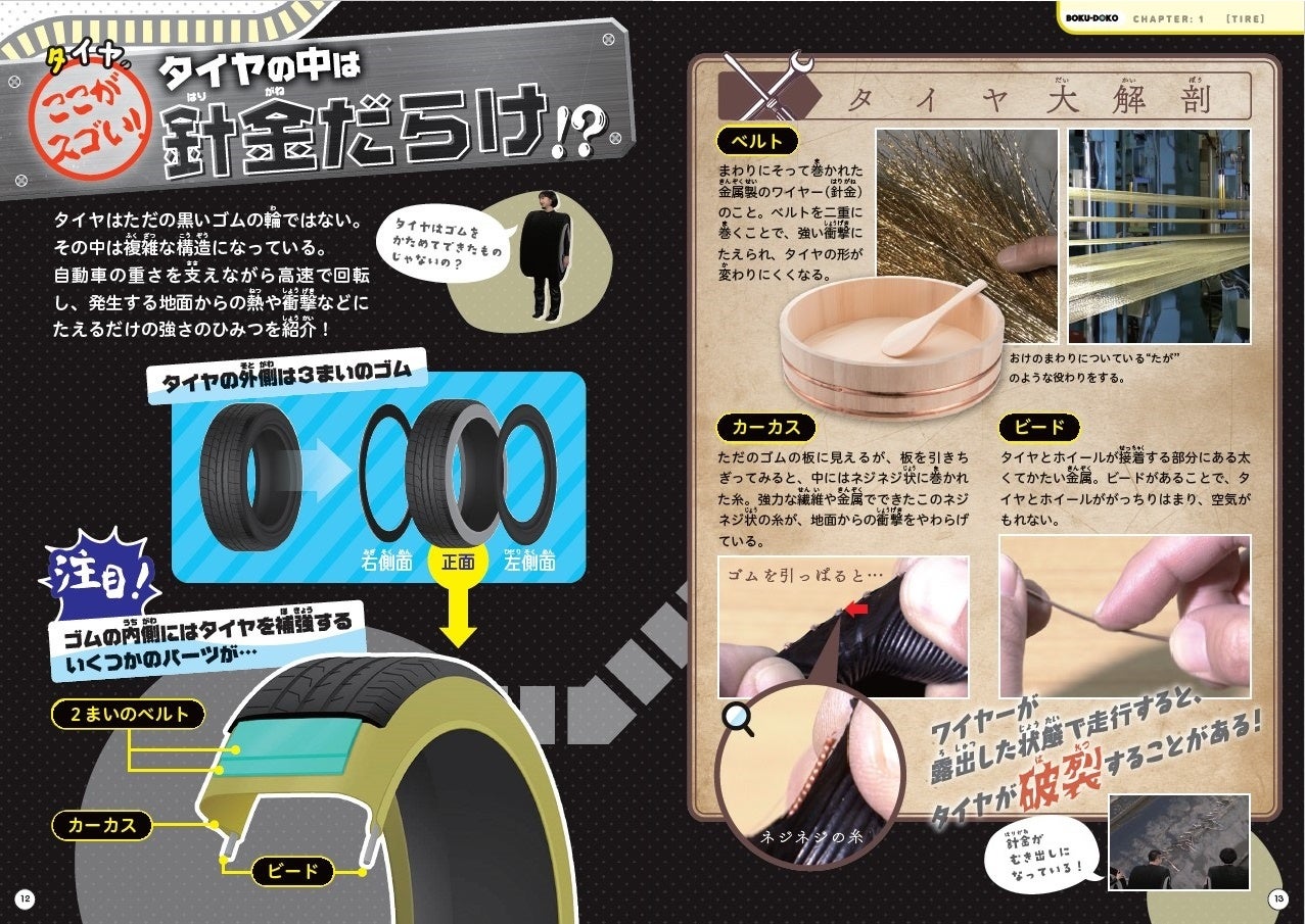 ほかにも、タイヤは単なるゴムの輪ではなく、中は針金だらけ。自動車の重さを支えながら高速で回転し、地面からの熱や衝撃などに耐えるだけの強さには秘密があります。前輪と後輪を取り換えて長く使われたのち、最後はバラバラに細かく刻まれ、工場や発電所の燃料として一生を終えます。