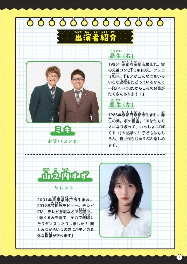 わたしたちに身近な “モノ”の一生を、ミキ(昴生、亜生)のふたりと山之内すずさんの3人が送る社会科見学エンターテインメント番組「ぼくドコ」が待望の書籍化! モノが生まれてから、わたしたちのもとに届き、消費されたのち、リサイクルされて生まれ変わるまでを紹介する『生まれ変わり編』と、命をまっとうするまでを紹介する『天寿まっとう編』の2冊が同時発売されます。どちらもビジュアルたっぷりです(3人の着ぐるみコレクションも掲載!)。