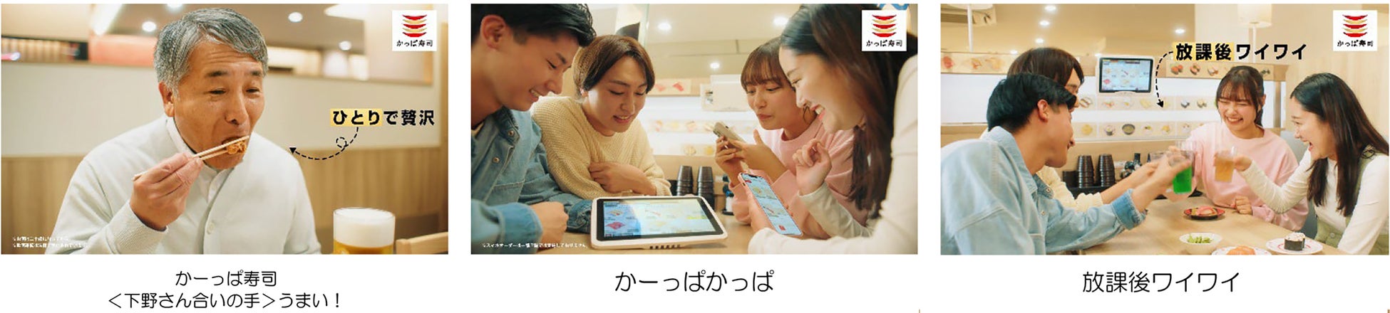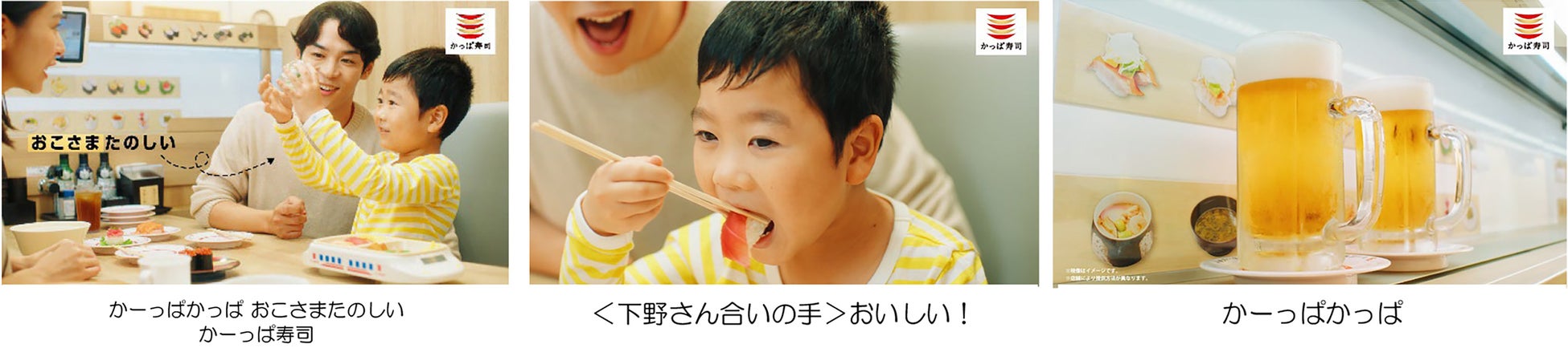 ベビーカーを持ち込める広々とした席で、ご家族でもゆったりとお食事いただけることに加え、お仕事終わりにちょっと一杯楽しみたい方や、ひとり時間のご褒美、放課後のお友達とのご利用など、さまざまなシーンで気軽にご来店いただけるようなお店づくりの工夫を、下野紘さんの素敵な歌声とともに、懐かしいCMソング「かーっぱかっぱ♪」に乗せてご紹介しています。