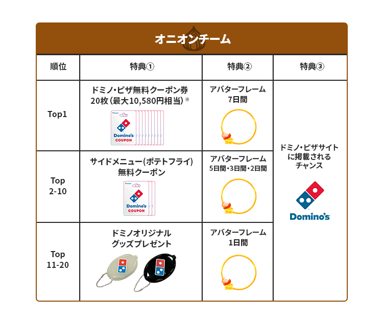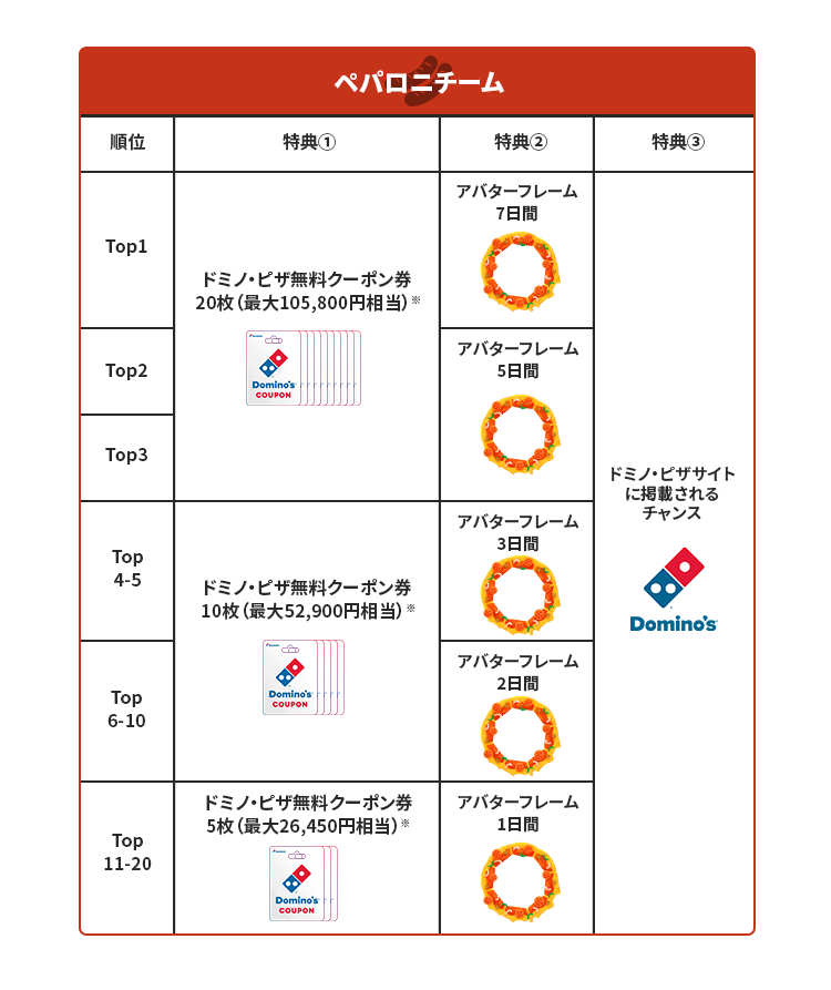 「マイドミノコラボキャンペーン」では、イベント期間中にリリースされるドミノ・ピザとのコラボギフトの獲得や動画投稿を踏まえて計算されるポイント数によりランキング順位が決まり、上位入賞者にはドミノ・ピザで使える最大105,800円分※のドミノ・ピザ20枚分の無料券やTikTok LIVEのプロフィールを装飾するアプリ内コラボアイテムなどの豪華特典を贈呈します。また、入賞者の中から選ばれた5名はドミノ・ピザの公式サイトに掲載されるチャンスも!