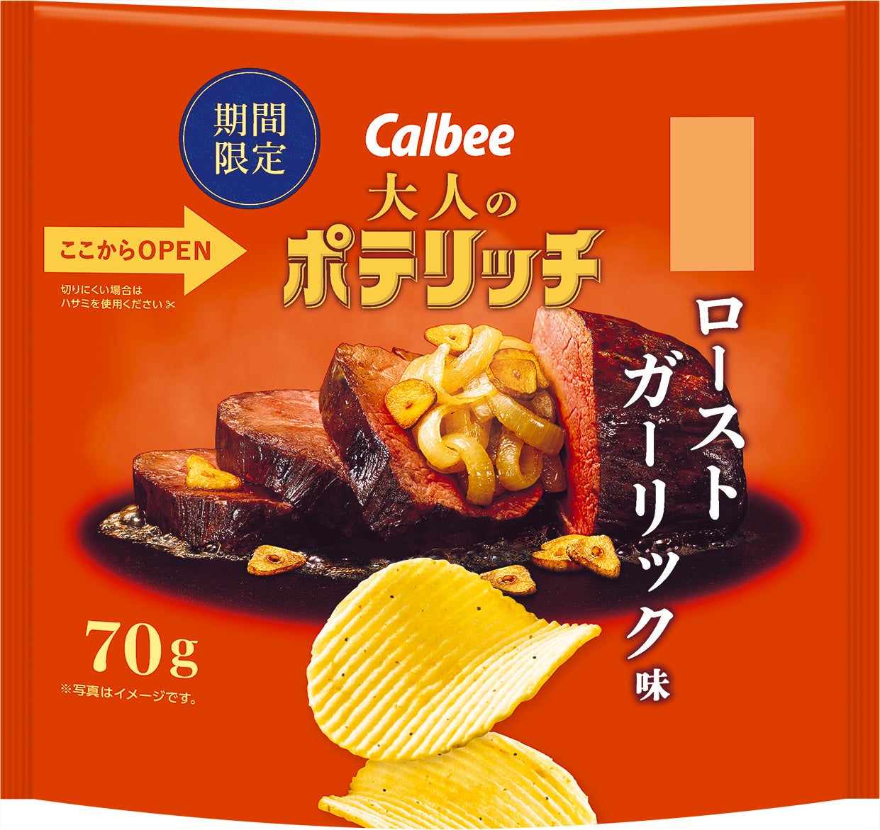 人気のニンニクをベースにした濃厚な厚切りポテトチップスが登場!チキンとビーフ2種類の肉の旨みをガーリックで存分に引き立てた『大人のポテリッチ ローストガーリック味』
