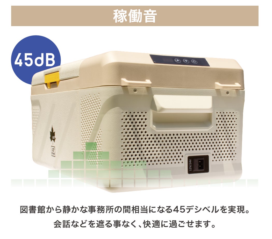 また、稼働音は45dBと、図書館から静かな事務所の間ほどの静音のため、会話などを遮ることなく快適にご使用いただけます。キャンプやBBQ、釣り、スポーツなど様々なシーンでのクーラーボックスとしても活躍するほか、ご家庭の冷凍庫に入りきらない冷凍食品の一時的な保存場所や、2台目の冷蔵・冷凍庫として非常時の備えにもおすすめです。
