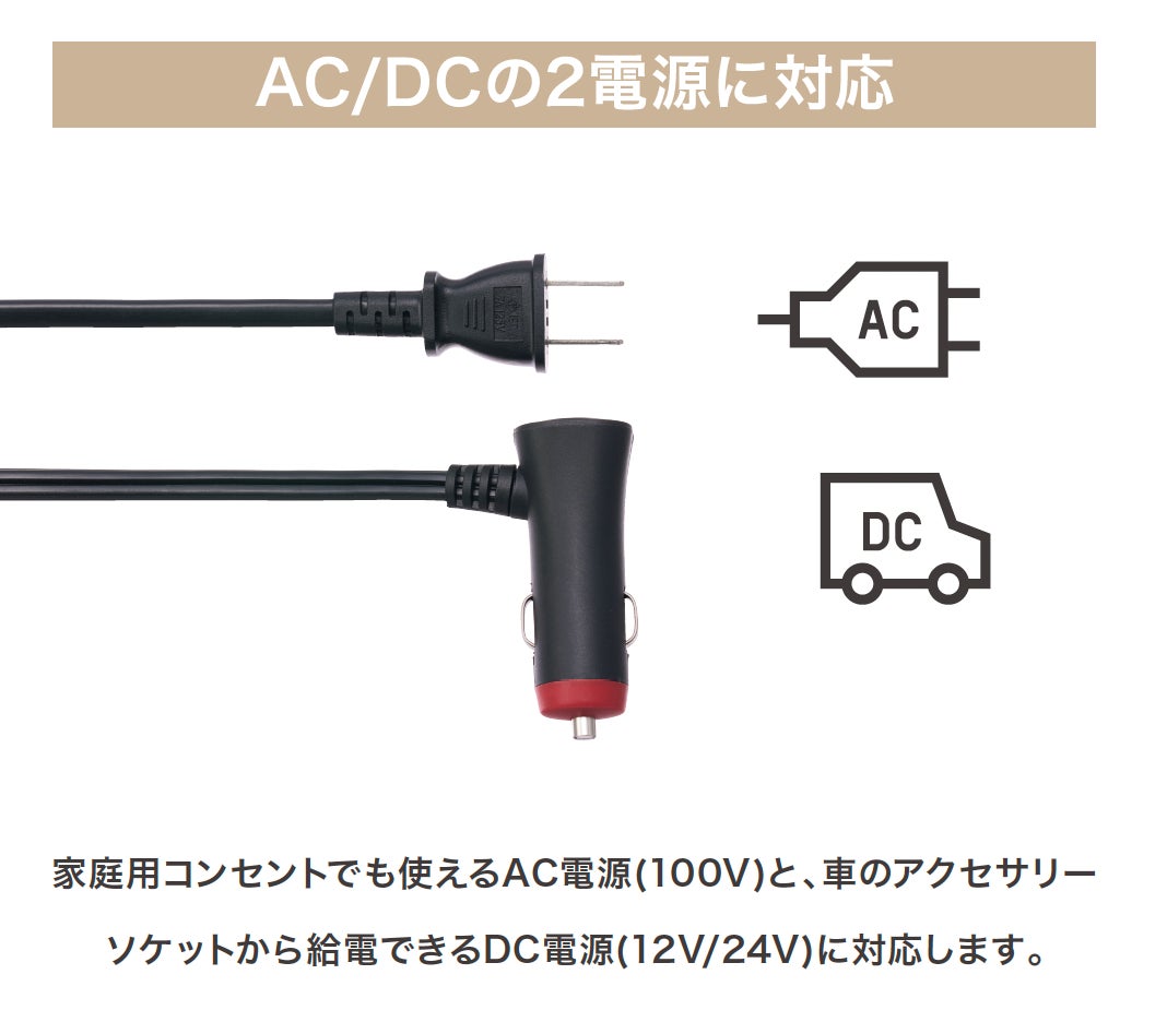 家庭用コンセントでも使えるAC電源(100V)と、車のアクセサリーソケットから給電できるDC電源(12V/24V)に対応。