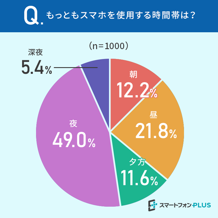 49%の方が「『夜』に最もスマホを使っている」と回答しており、その理由は「その日の情報が最も入ってくる時間帯だから」や「1日の終わりでゆっくりできる時間だから」といったものが挙げられていました。