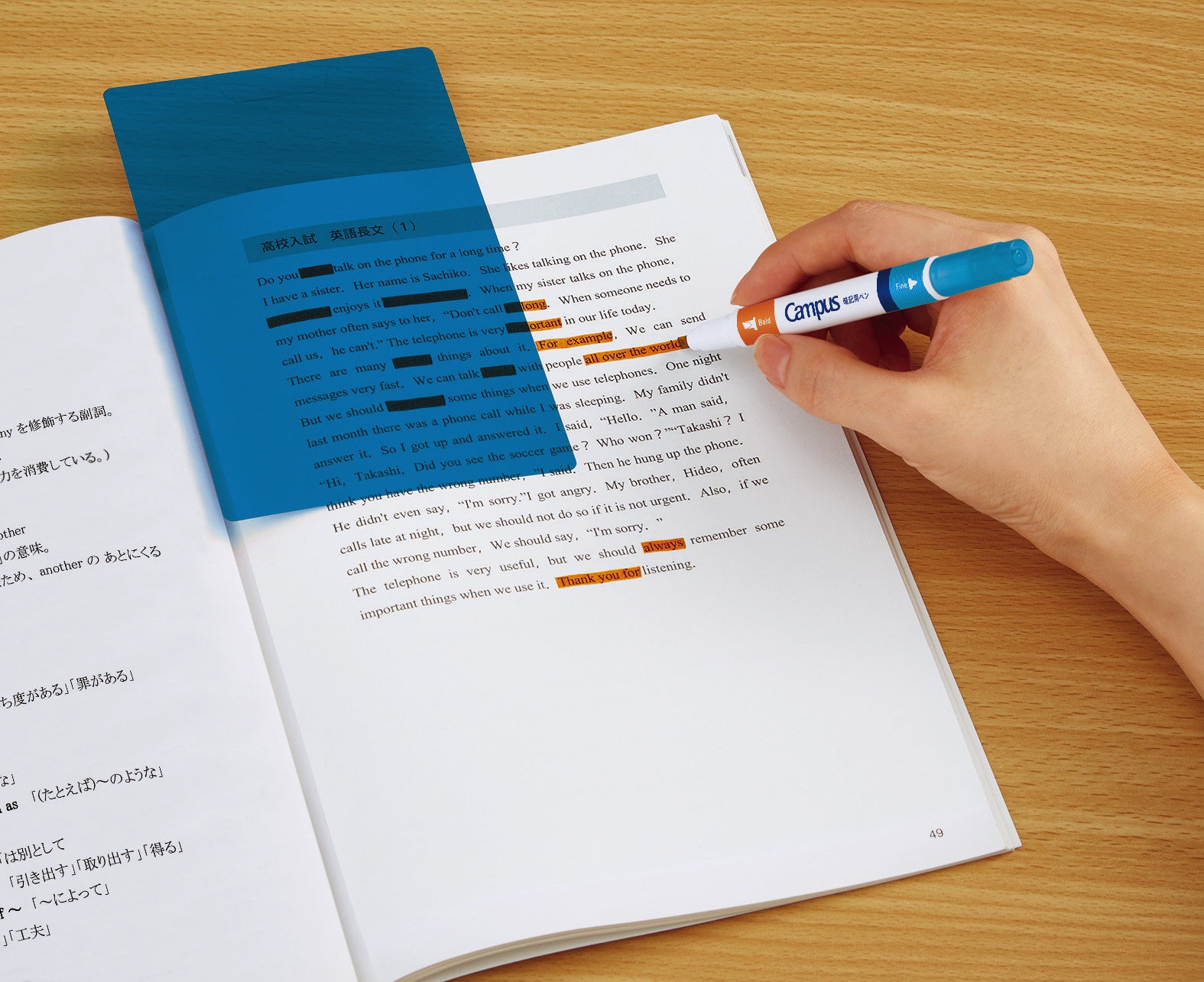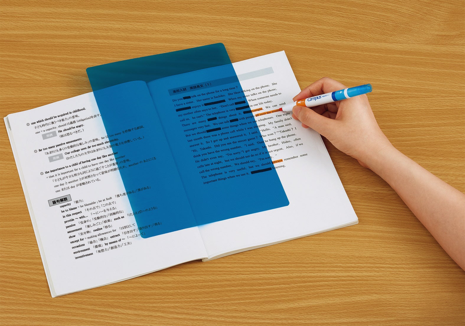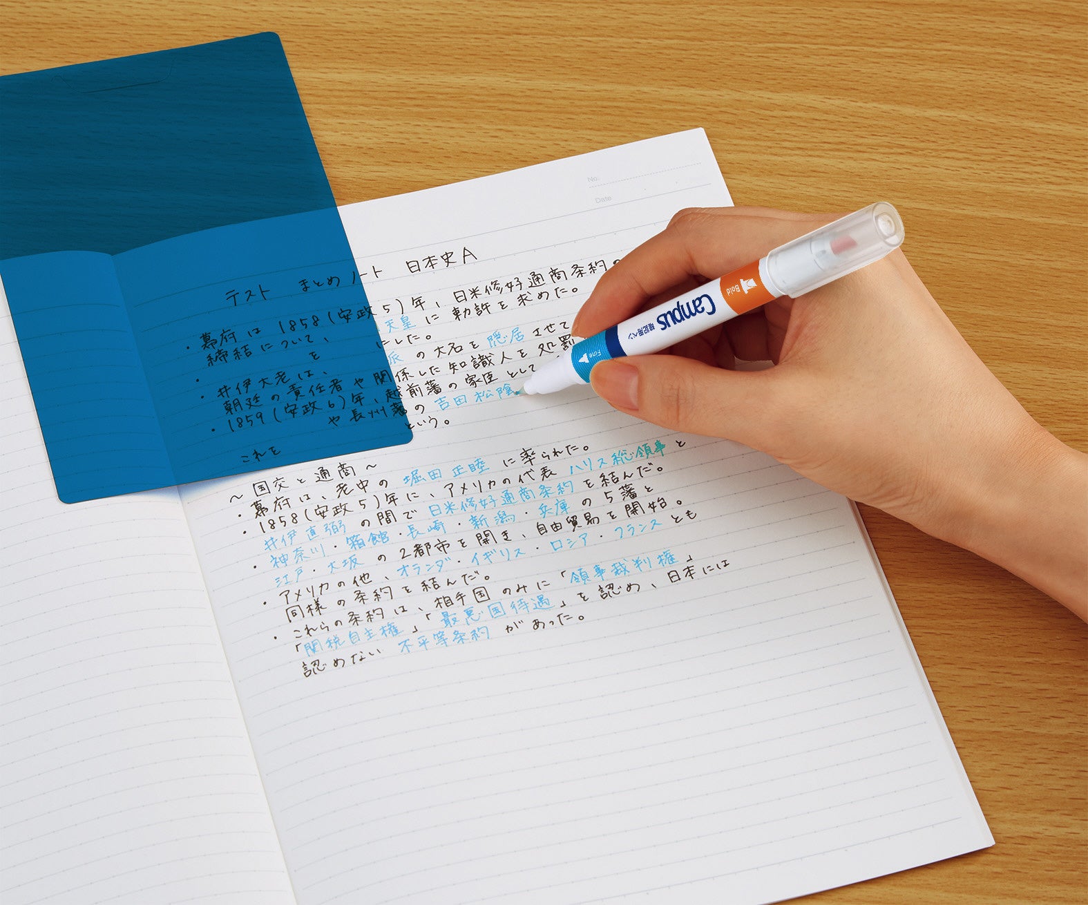 2023年8月に発売した「キャンパス 青色シートで覚える暗記用ペンセット」は、集中実感効果が期待できる青色(※1)を採用した暗記用シートと、青色シートで文字が隠れるオレンジマーカーと水色の極細ペンが1本になった暗記用ペンのセットです。発売以来「青色シートを使うと普段より暗記学習に集中できる」といった効果を実感する声が聞かれるなど、学生を中心に支持をいただいています。