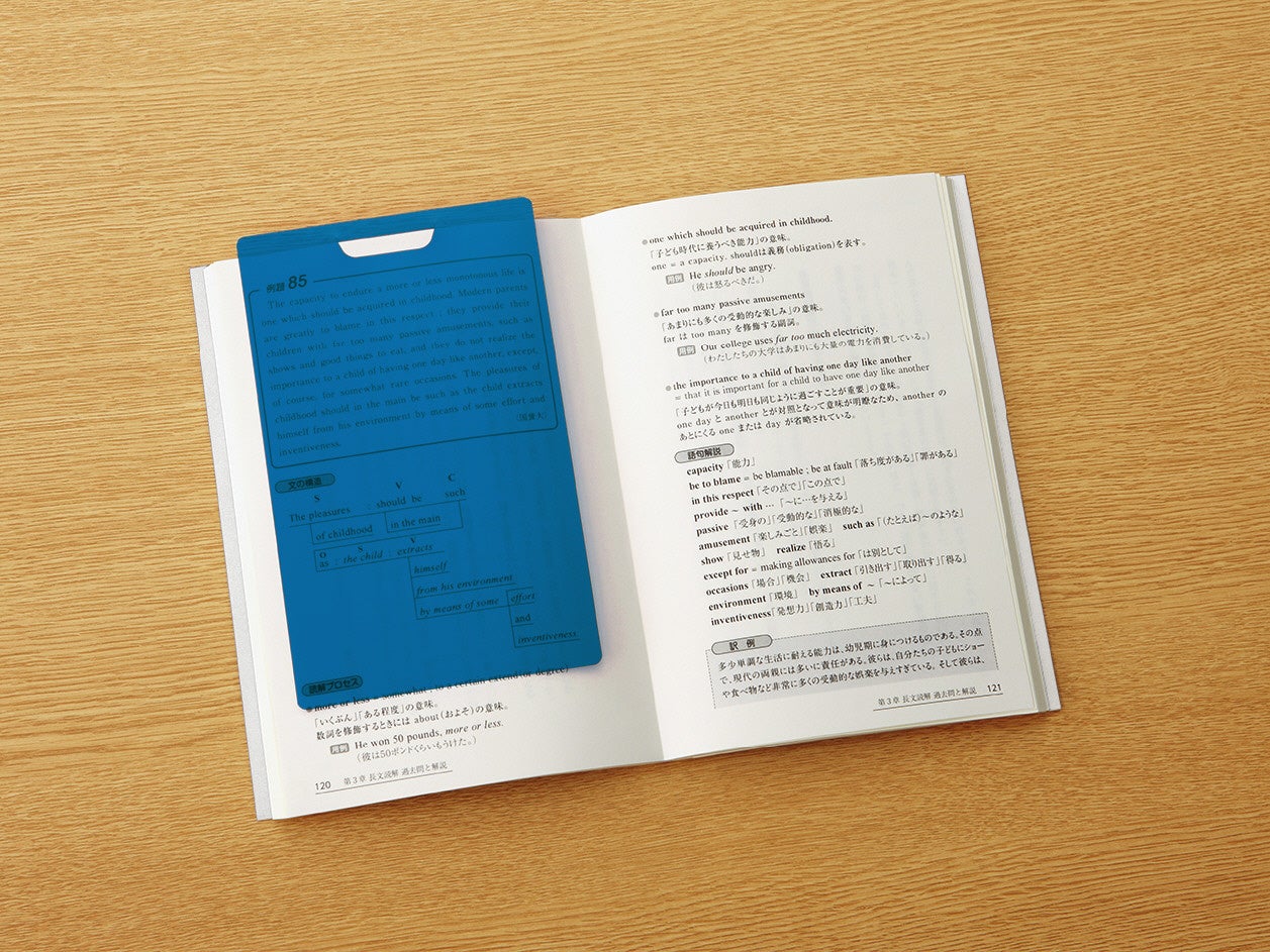 小サイズの青色シートの上部には横に4cmほどの切り込みが入っており、教材のページに引っ掛けて挟んでおける仕様となっています。教材に挟んで一緒に持ち運んでも紛失しにくいため、移動中の電車内などでの学習にもおすすめです。また、しおり代わりとしても使用でき、進捗具合などを把握しながら学習ができます。