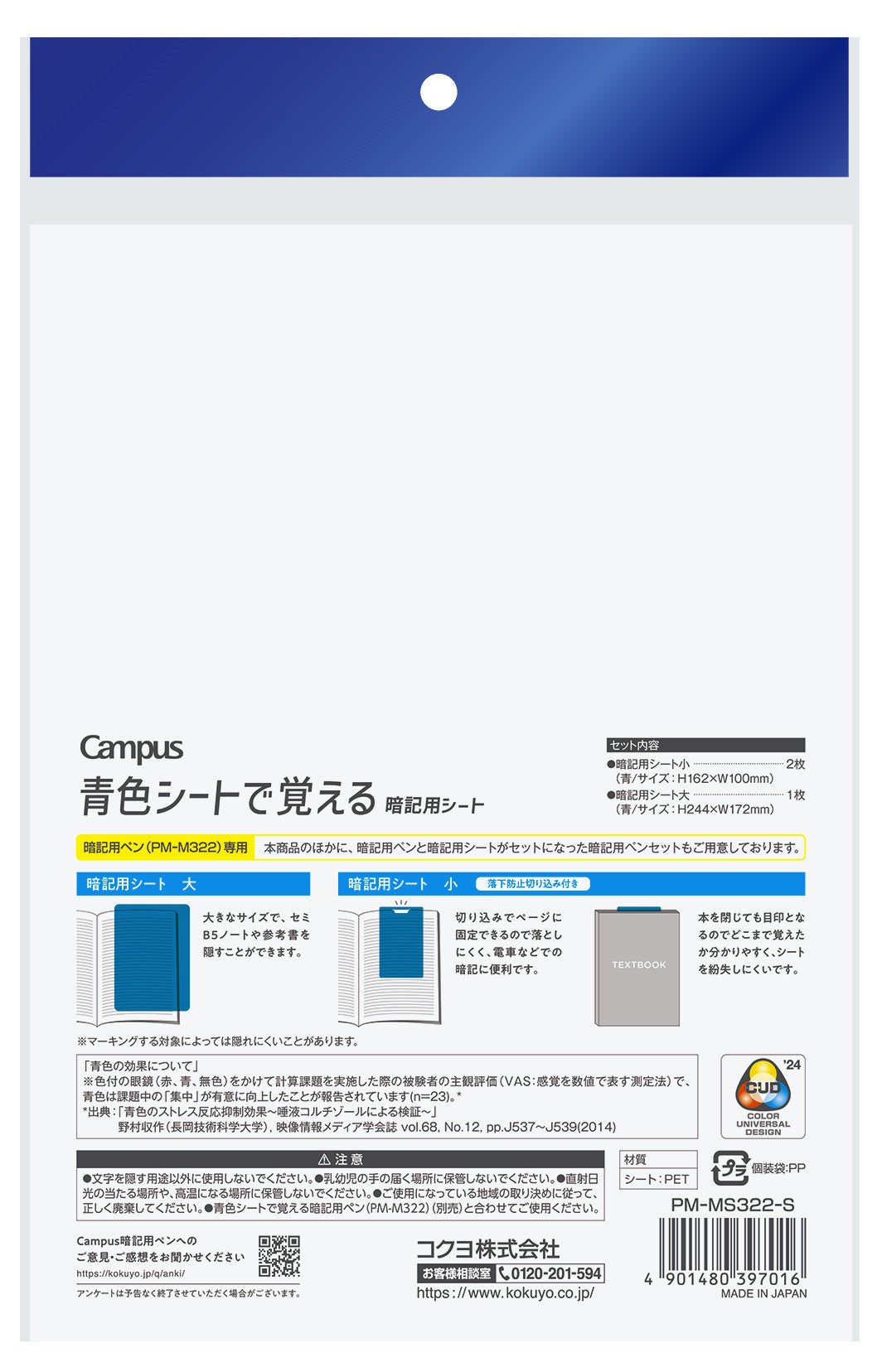 購入後のアンケートでは、「複数の教材に挟んでおくため、暗記用シートのみを追加で購入したい」との声とともに、約40%の方がシートの複数枚持ちを希望していることがわかりました(2024年6月実施/n=44名)。そのような声を背景に、今回サイズ違いの青色シートのみをセットにした「キャンパス 青色シートで覚える暗記用シート」を発売。一般的な英単語集などに収まりのいい小サイズ2枚と、教科書やノートを使用した暗記学習にも便利な大サイズ1枚の、2サイズ3枚セットです。既発売の「キャンパス 青色シートで覚える暗記用ペン」で筆記した文字に本商品を重ねることで文字が隠せるので、合わせての使用がおすすめです。