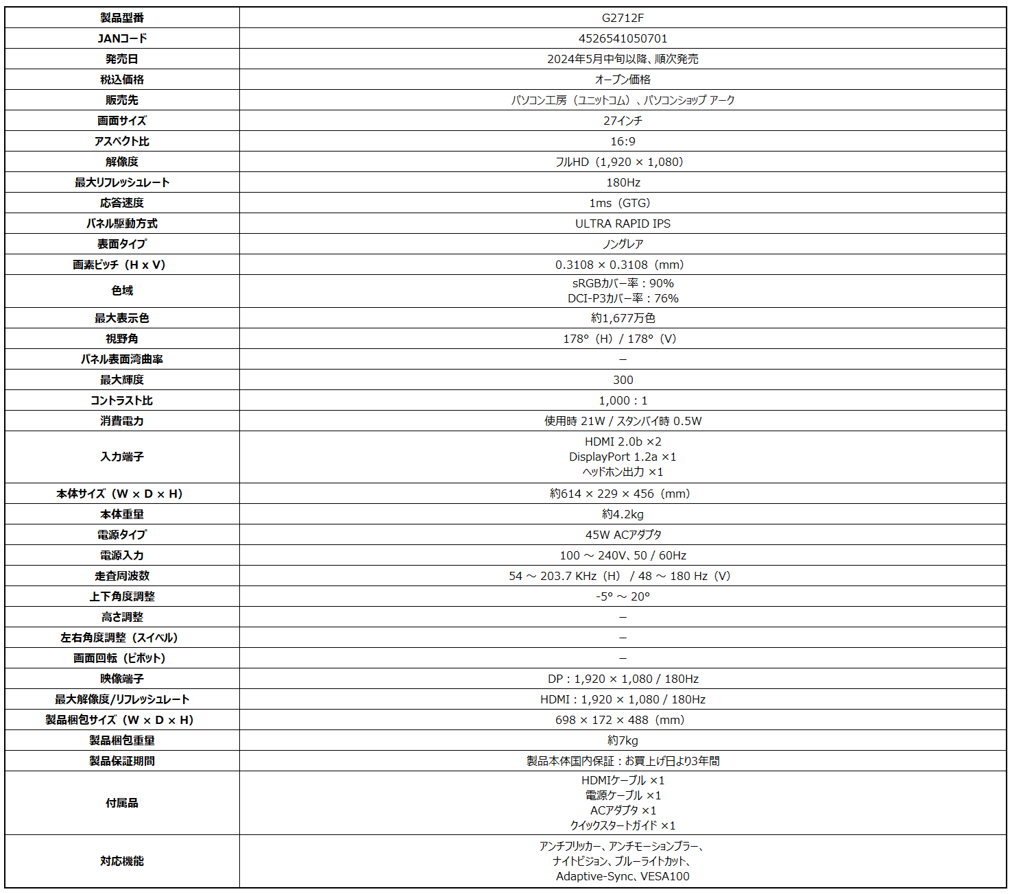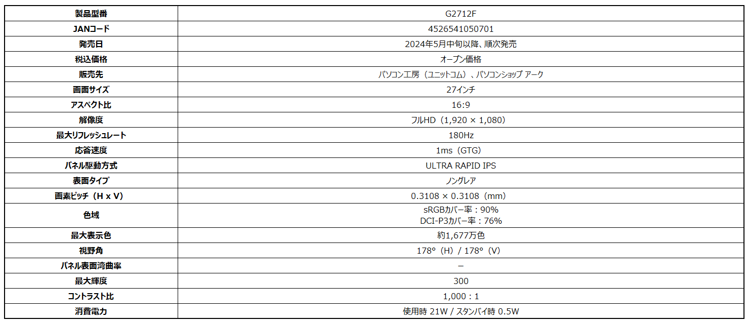 MSI初となるULTRA RAPID IPS搭載ゲーミングモニター27インチ・フルHD・リフレッシュレート180Hz・1ms(GTG)ユニットコム専売モデル「G2712F」発売
