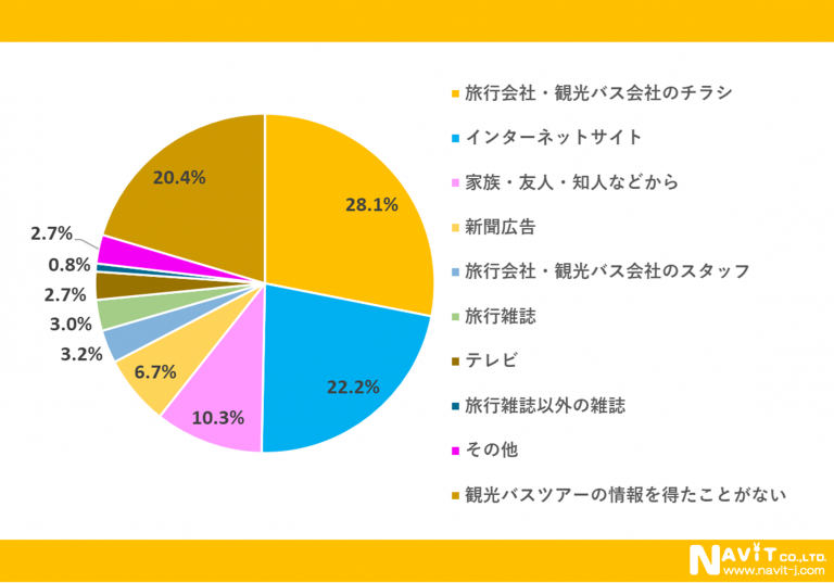「観光バスツアーの情報をどこで得ていますか?」という質問については、「旅行会社・観光バス会社のチラシ」が28.1%、「インターネットサイト」が22.2%、「家族・友人・知人などから」が10.3%という順になりました。