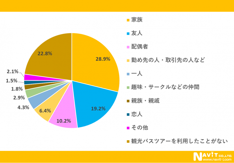 「誰と観光バスツアーを利用することが多いですか?」の質問については、「家族」が28.9%、「友人」が19.2%、「配偶者」が10.2%という順になりました。家族と一緒に利用している方が多いようですね。