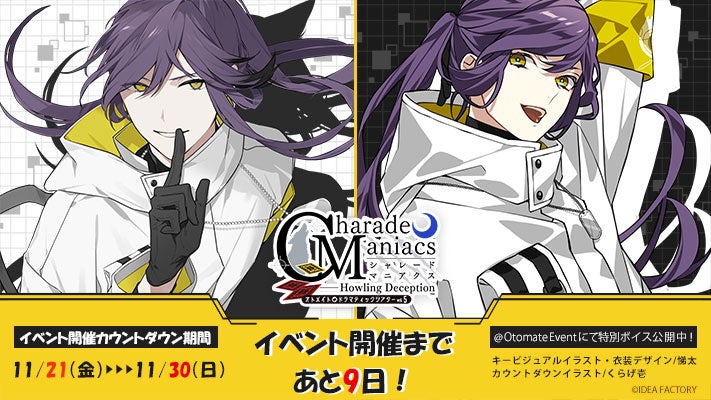 オトメイトイベント公式X(https://x.com/OtomateEvent)とイベント公式HP(https://www.otomate.jp/event/dramatic/charade_maniacs/)では本日より1キャラクターずつ、カウントダウンボイスを公開していきます。