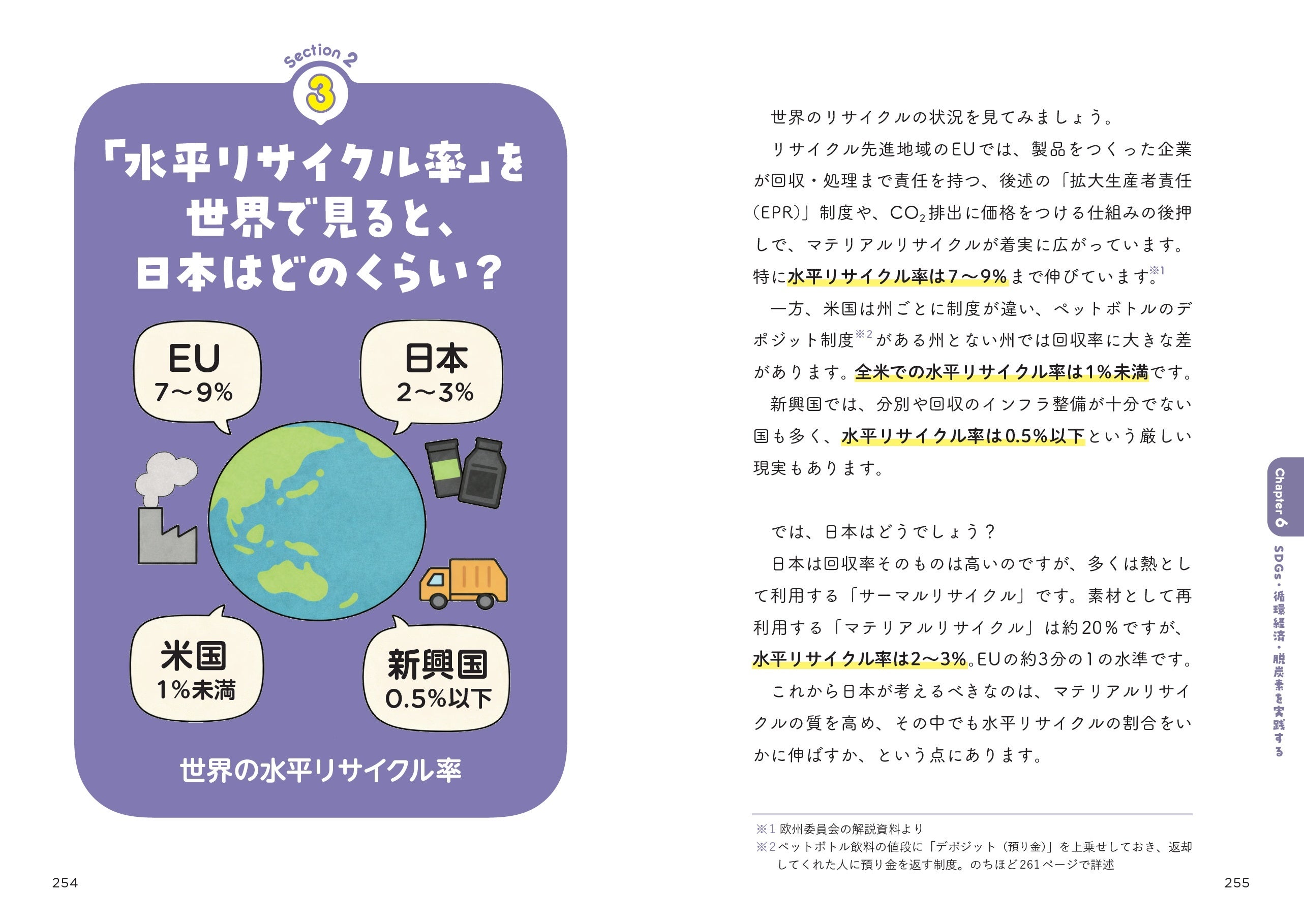 本書は、こうした衝撃的なデータや事実を基にして、「なぜリサイクルが進まないのか」「私たちが分別したプラスチックはどこへ行くのか」を丁寧に解き明かし、左側にイラスト、右側にやさしい解説という形式でお伝えします。
