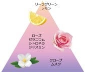 トップに香る爽やかなレモンとリーフグリーンの香りと、ローズ・ゼラニウム・シトロネラ・ジャスミン・グローブ・ムスクなどのスイートフローラルが調和した香りです。