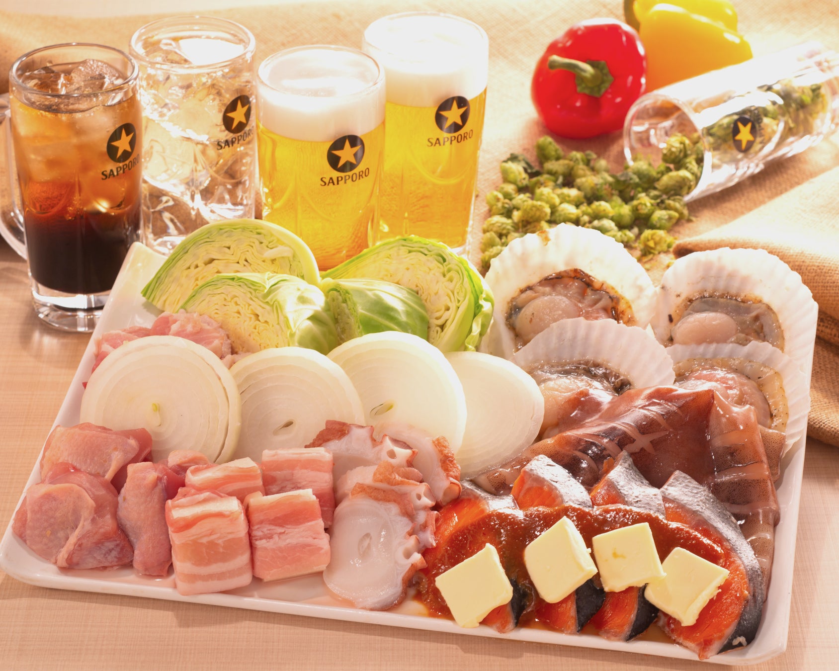 〈内容〉銀鮭ちゃんちゃん焼き/ホタテ貝/スルメイカ/水タコ/豚バラ肉/鶏肉BBQ/豚バラ切り餅/BBQ野菜(キャベツ・玉ねぎ)