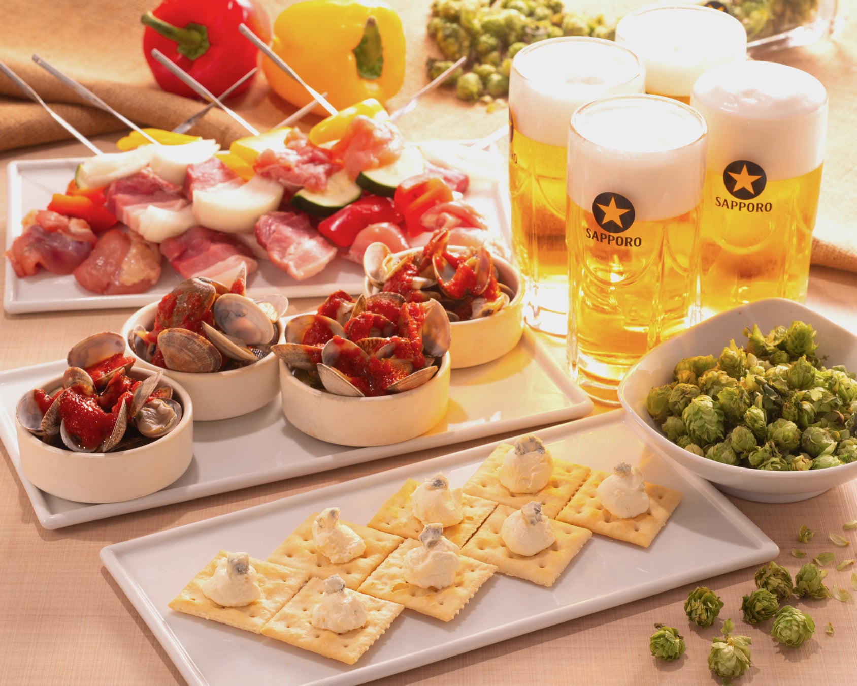 〈内容〉ブルーチーズ/数の子チーズ クラッカー/あさりのアヒージョ/スパイシーチキンBBQ串/室蘭串/チキンBBQ串/追いホップ