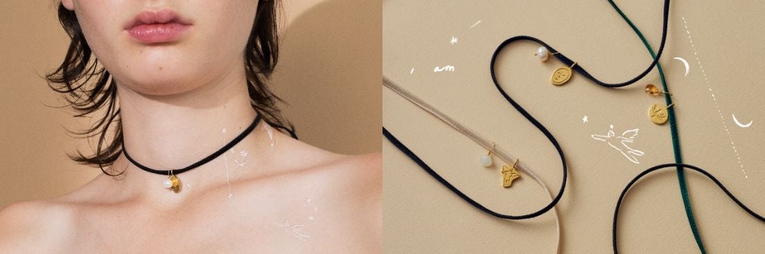 「opnner」Kaho Iwaya氏とデザインからともに制作したチョーカーを発売いたします。Iwaya氏が特別に書き下ろした絵柄を彫り込んだチャームと小粒のストーンを、3色のベルベットチョーカーにそれぞれ配しました。
