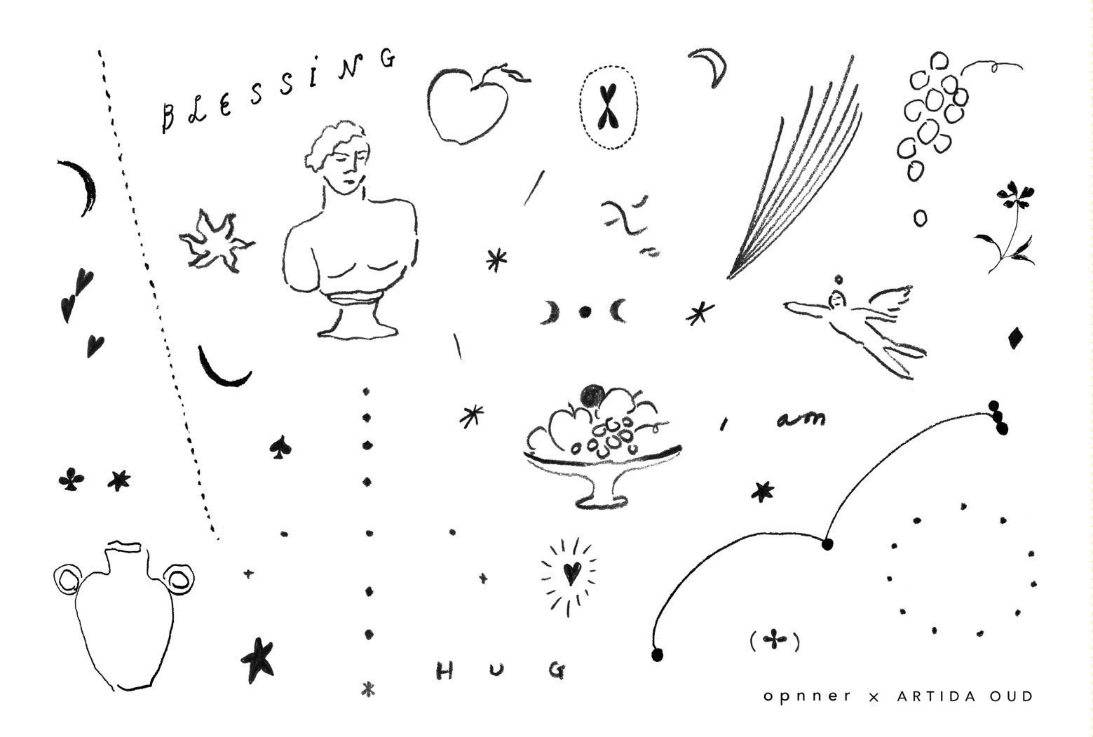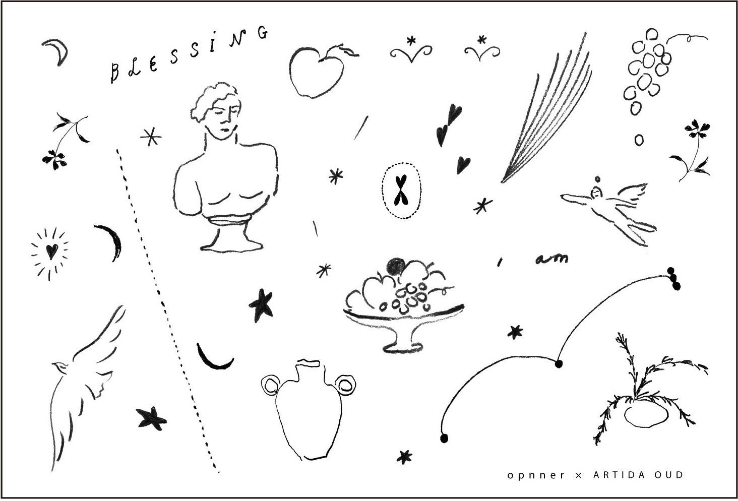 デザイナーkaho Iwaya氏による、人気のタトゥーシールブランド「opnner」。ARTIDA OUDの“Iam” ドネーションブレスレットとセットで展開するタトゥーシールの制作を手がける。