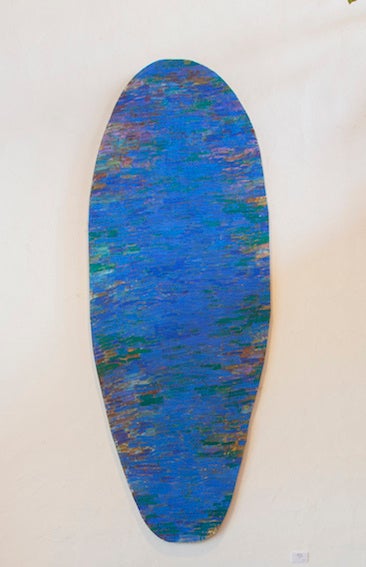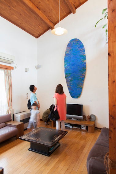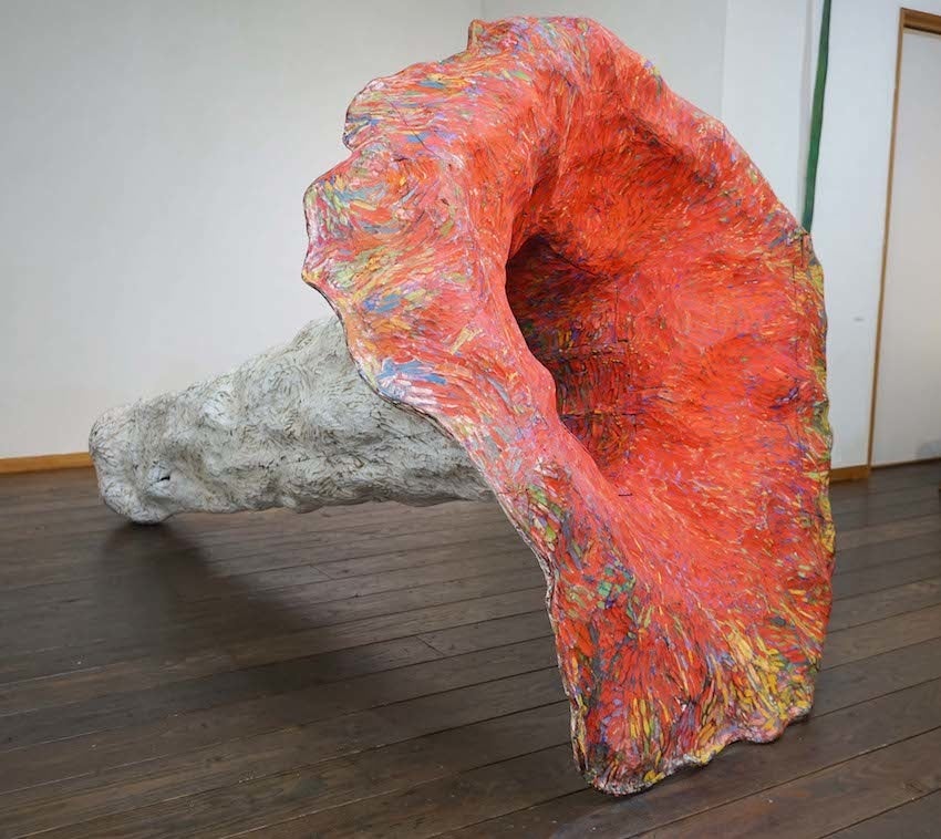 | 『絵画の庭-横臥花』について 私は長らく、「絵画の庭」というタイトルで、木材に色彩を施した立体作品を制作してきました。 立体作品でありながら、絵画作品である、として作り続けています。 その絵画とは、既成のタブロー表面を離れ、色彩=色材が華麗に繰り広げられるに足る表面を如何に形作るかというものです。 その姿を求めるうちに、木を彫り進み、その表面に色彩を繰り広げることで、自分なりの絵画の姿を求めて続けています。 今回メインとなる「絵画の庭―横臥花(オウガカ)」は、横向きに花が広がったような形態をしており、長さは約2,7メートルです。 中は空洞であり、内側全面が彩られています。逆に外側は白色に塗られていますが、これは色彩面が絵画を担い、白色の側がその裏側であ り、いわばキャンバスの裏側のようなものと考えています。 知の好奇心で満ち溢れた蔦屋書店の空間において、奥底から噴出した色彩が、見る人の視線を引き込んで離さない、そんな様子になることを楽しみにしています。 文:原田要 2022年1月 |