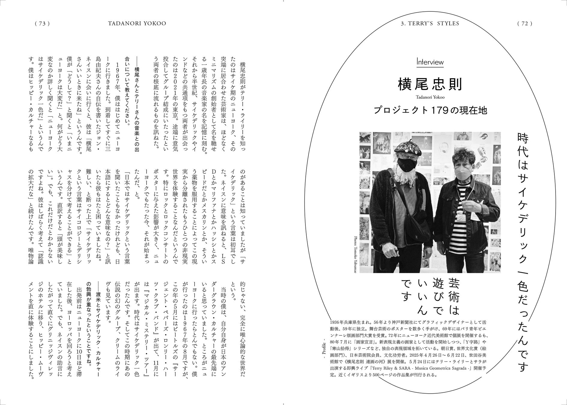 60年代のニューヨークでサイケデリック、ヒッピームーブメントに触発され、2022年からはテリー・ライリ―とグループ活動を行う横尾忠則、近年の活動を語る上では欠かすことのできない、ヨシダダイキチ(シタール奏者)、サラ(弟子/継承者)、宮本端(プロデューサー)といったキーマンへのロングインタビューも読み応えたっぷりです。