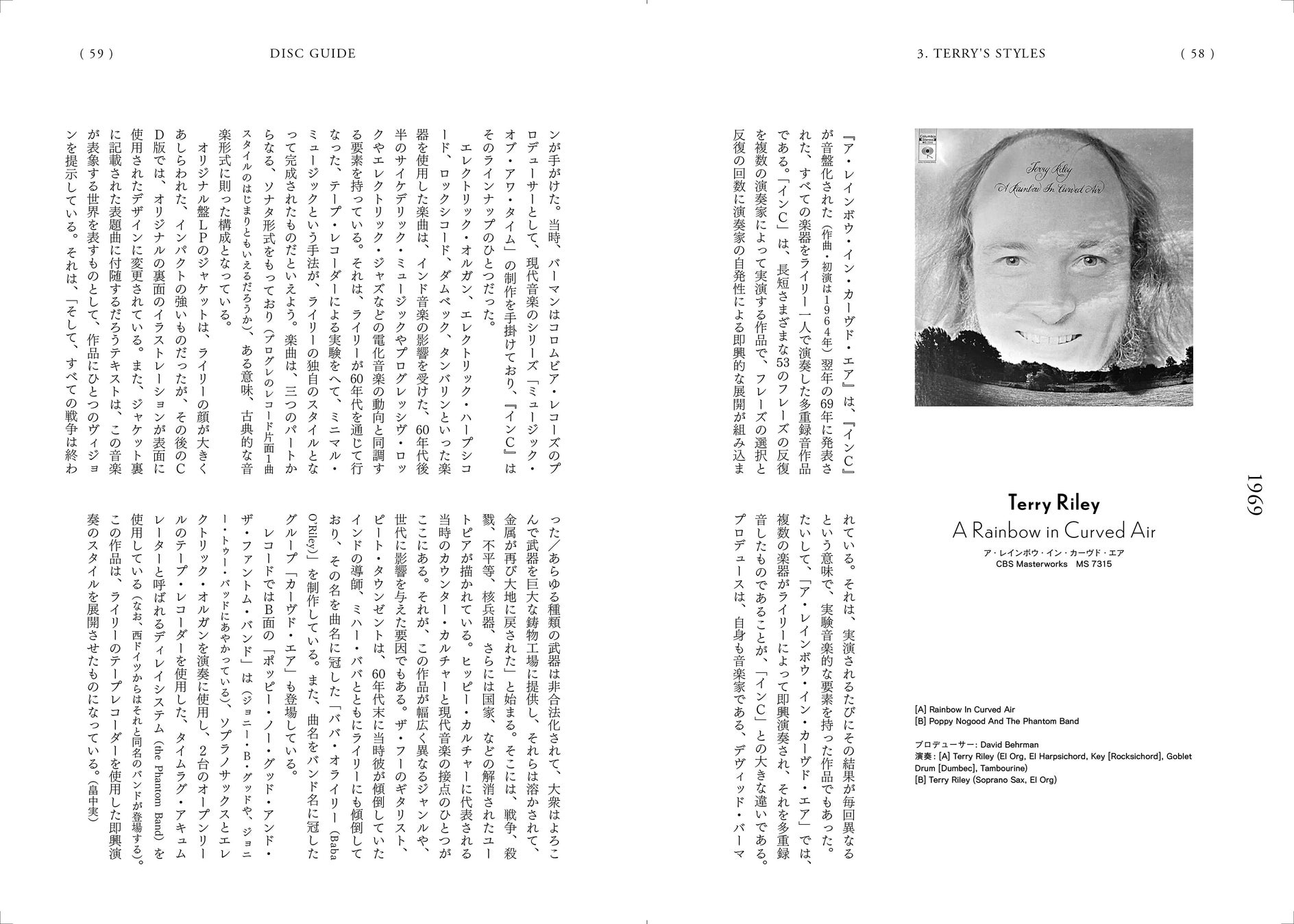 本書では、そんなテリー・ライリーの数ある作曲作品より、レコード、CD、カセットなど音源化された作品を網羅(一部デジタルリリース含む)。