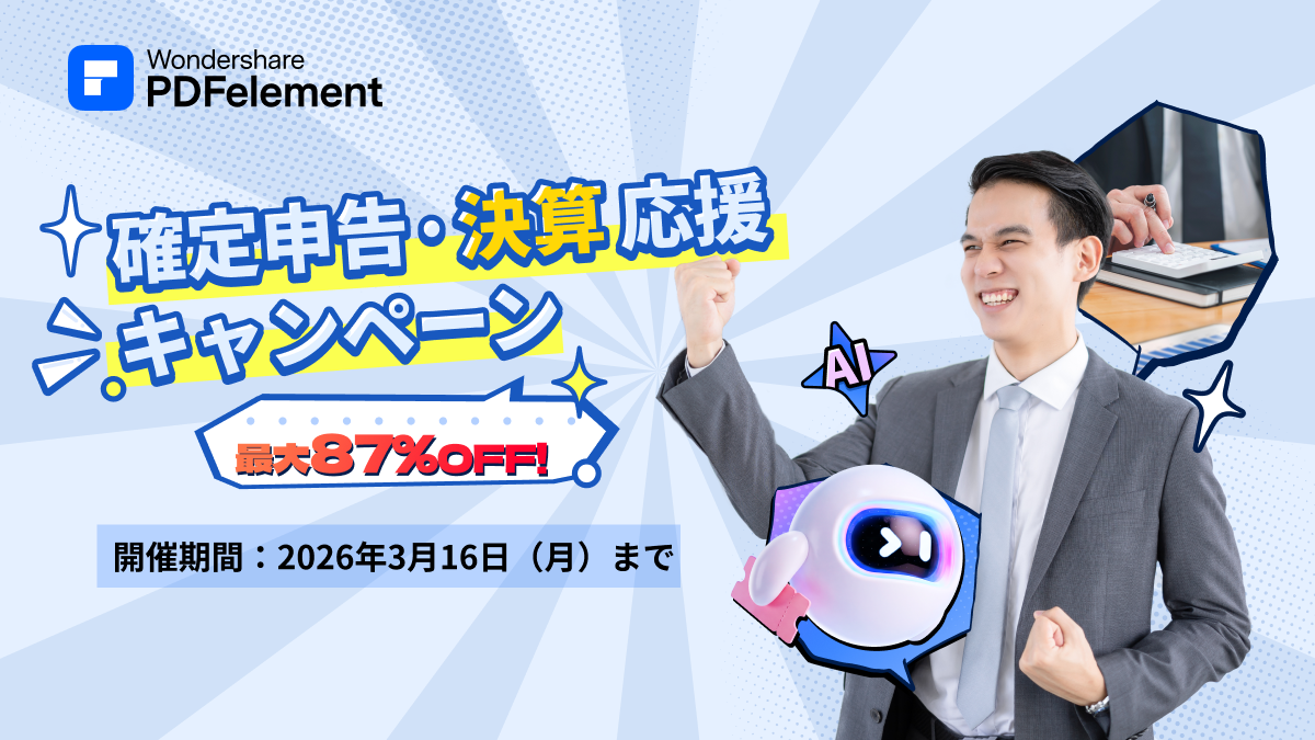 株式会社ワンダーシェアーソフトウェア(東京都港区、代表:呉太兵)は、オールインワンPDF編集ソフト『PDFelement(PDFエレメント)』において、「確定申告・決算応援セール」を2026年3月16日(月)まで開催しております。