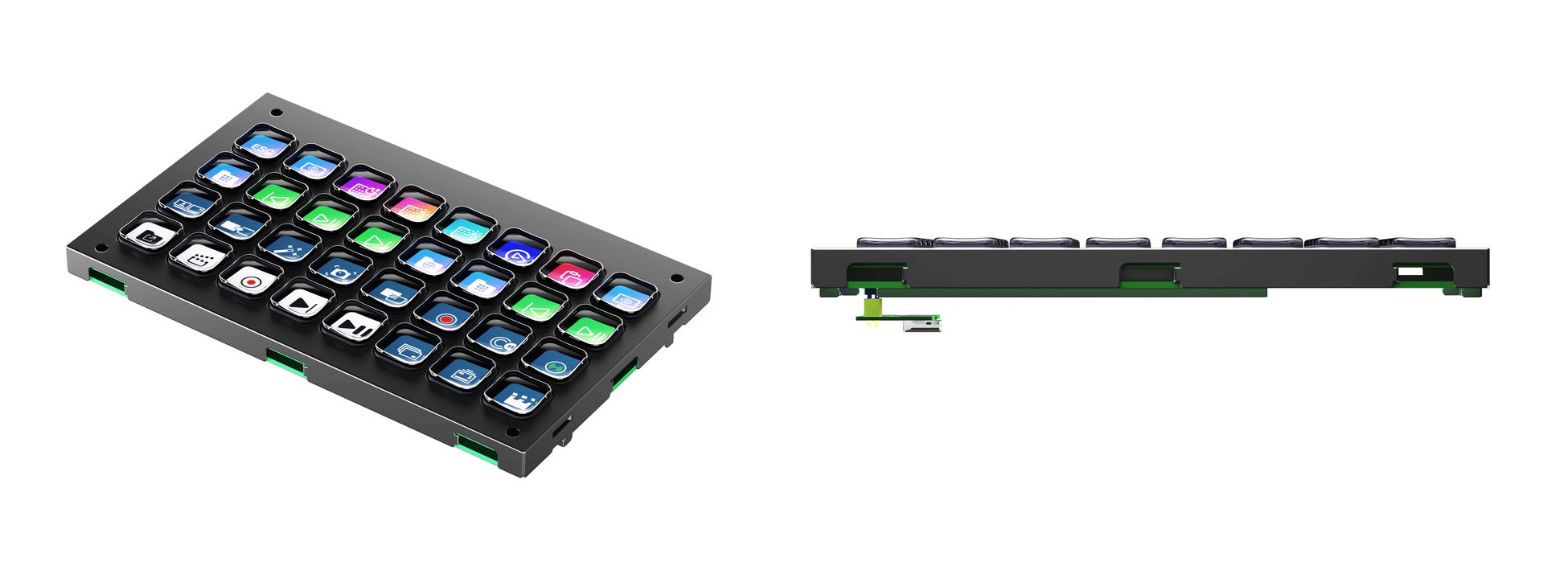 「Stream Deck Module」は、ショートカットキーボード「Stream Deck」シリーズの基本機能を小型モジュールとして提供する製品です。ブランドロゴを省いた外観は、機器や筐体に組み込む際に目立たず、デザインを損ねにくい構成で、スタジオやオフィスなどの業務用途から個人の制作環境まで、既存のシステムに組み込みやすくなっています。専用の「Stream Deck」アプリを利用して各LCD(Liquid Crystal Display、液晶ディスプレイ)キーにドラッグ&ドロップで簡単に機能を登録でき、アプリの起動やフォルダの閲覧など複数の操作を整理して管理できます。さらに、公式のSDK(Software Development Kit)と数百種類のプラグインに対応しており、ユーザーのシステムやアプリケーションに合わせて機能を追加することが可能です。搭載キーの数により、6キー、15キー、32キー※の3つのモデルがあり、用途に合わせて選択できます。本体はアルミ素材を使用し、汎用性の高いUSB Type-Cで各機器と接続可能です。