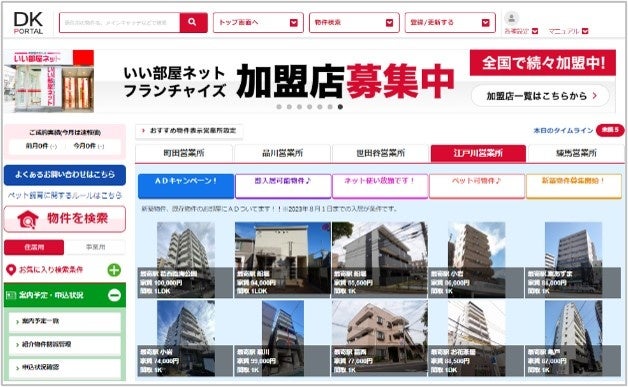 「DK PORTAL」は、空室情報やお得な最新情報を提供している不動産会社様専用のポータルサイトです。申込・契約に伴う煩雑な業務を電子化し、簡単かつスピーディーに行うことができるなど、不動産会社様の業務軽減や収益アップにつながる様々なサービスや機能を提供しています。