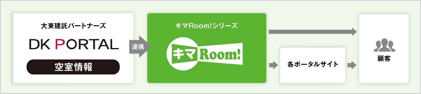 「DK PORTAL」は、同社が不動産会社様向けに空室情報などを提供するポータルサイトです。今回のデータ連携により、不動産業務支援サービス「キマRoom!」を利用する不動産会社様に、「DK PORTAL」の空室情報がリアルタイムに連動されます。これにより、同社が管理する賃貸建物への入居者斡旋機会が増加します。