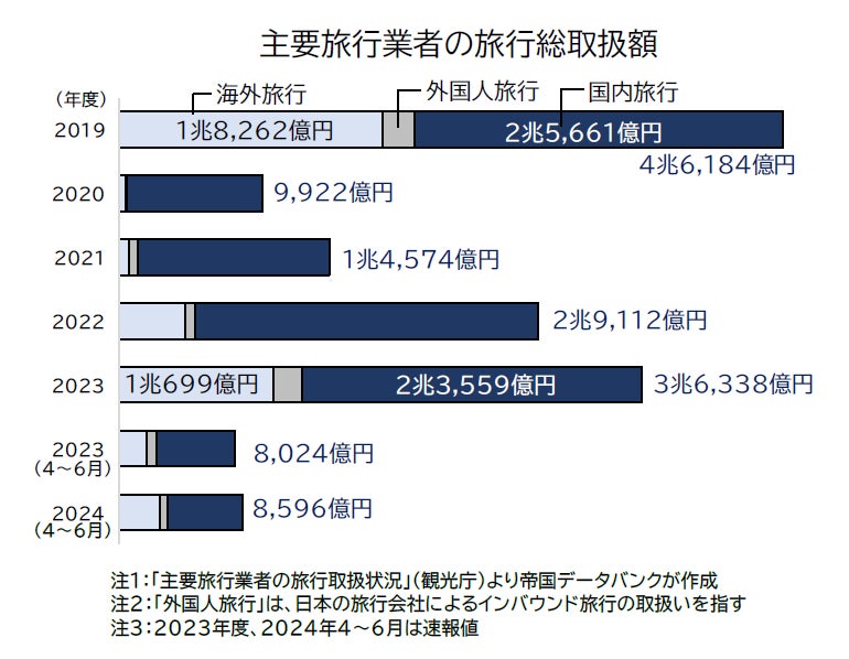 2024年度に入ってからも、「海外旅行」の回復は鈍く、物価高による節約志向や天候などの環境要因、人手不足などの影響で「旅行総取扱額」の2024年4~6月の累計総額は、前年同期を7.1%上回るにとどまり、通期でもコロナ禍前の2019年度を上回るには厳しいペースにある。