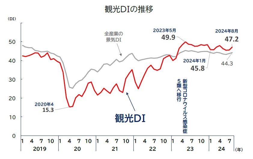 実際に5類に移行した同年5月の観光DIは49.9を記録し、その後は多少の揺れ幅はあったものの、インバウンド需要を背景に48台で推移した。