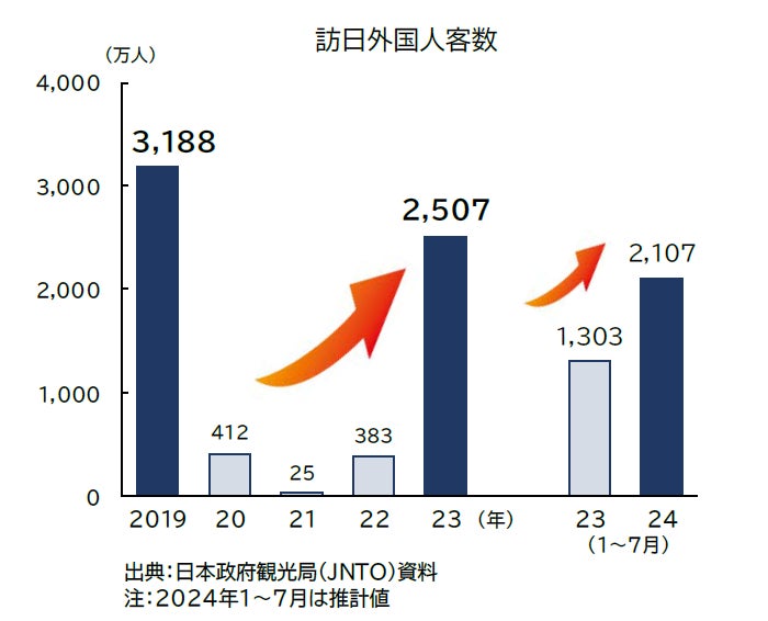 日本政府観光局(JNTO)が発表した「訪日外国人客数」によると、2024年の訪日外国人客は1~7月までの合計が2107万人に達し、前年同期の1303万人を上回った。通年で前年を超えるのは確実と見られ、そのペースはコロナ禍前の2019年をも上回っており、国内の観光産業を牽引しているといわれる。