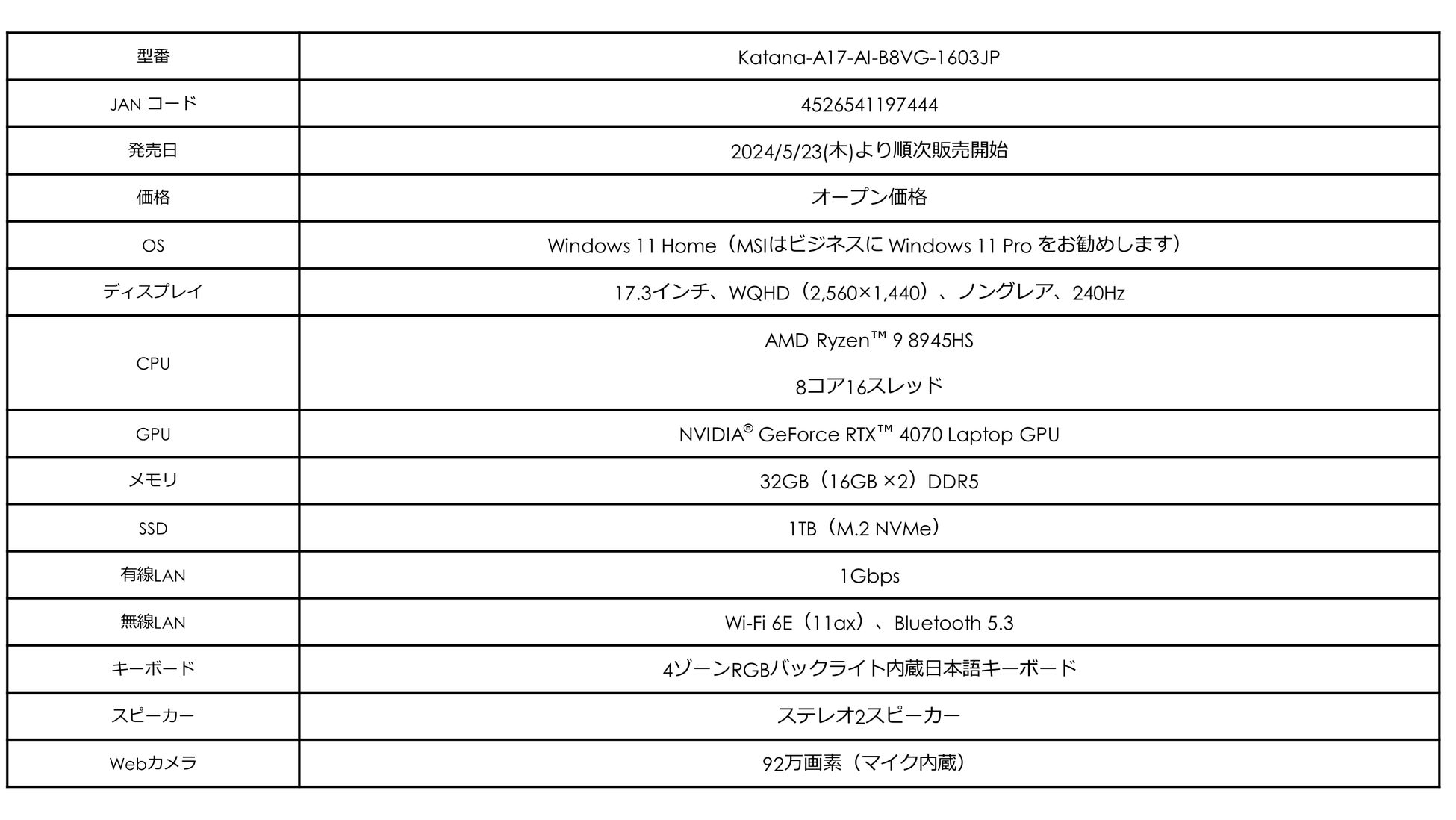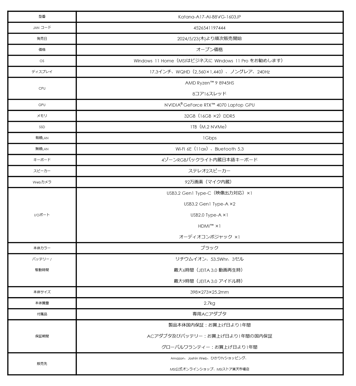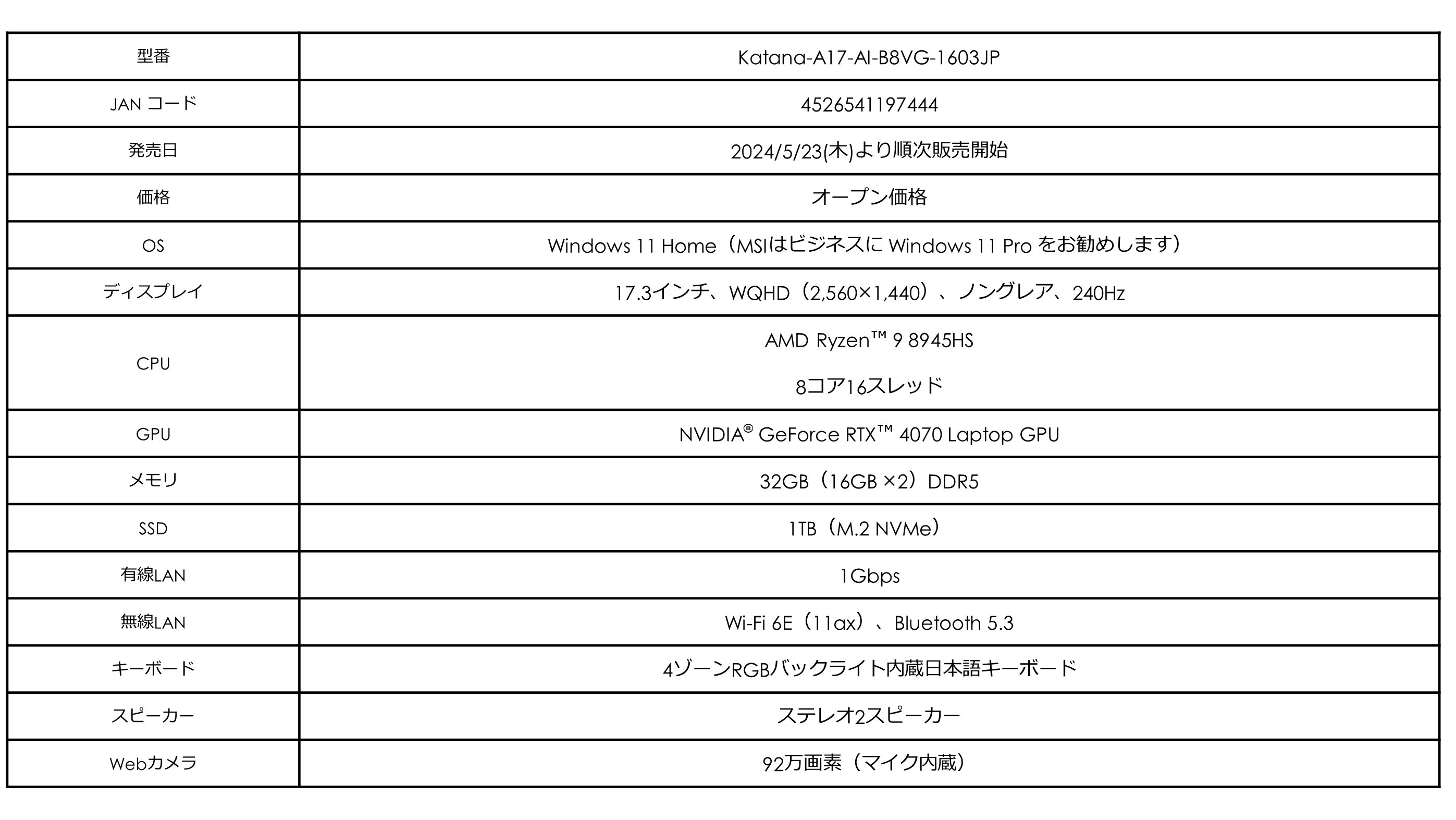 ・Katana A17 AI B8V シリーズ製品ページ:https://jp.msi.com/Laptop/Katana-A17-AI-B8VX