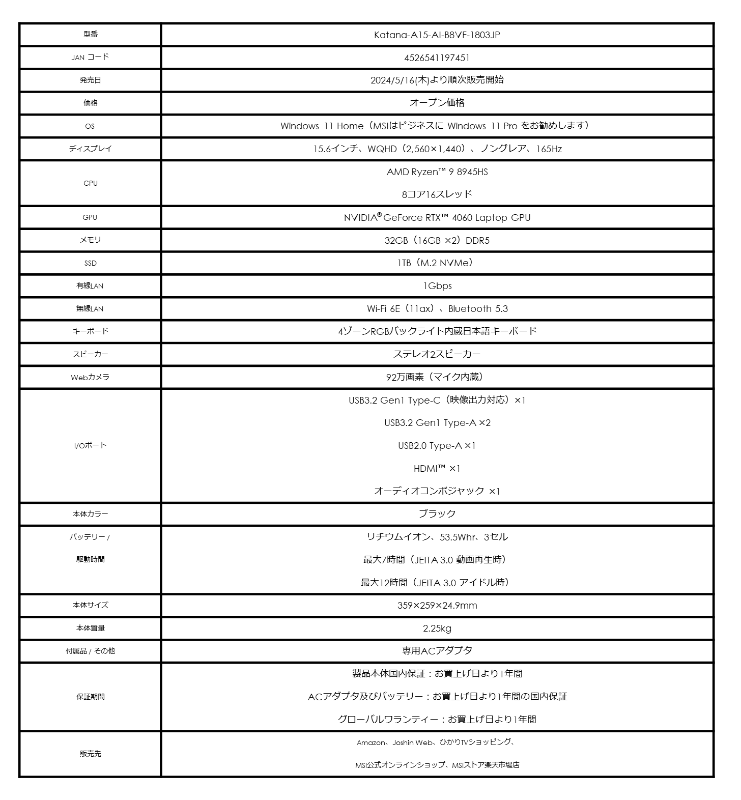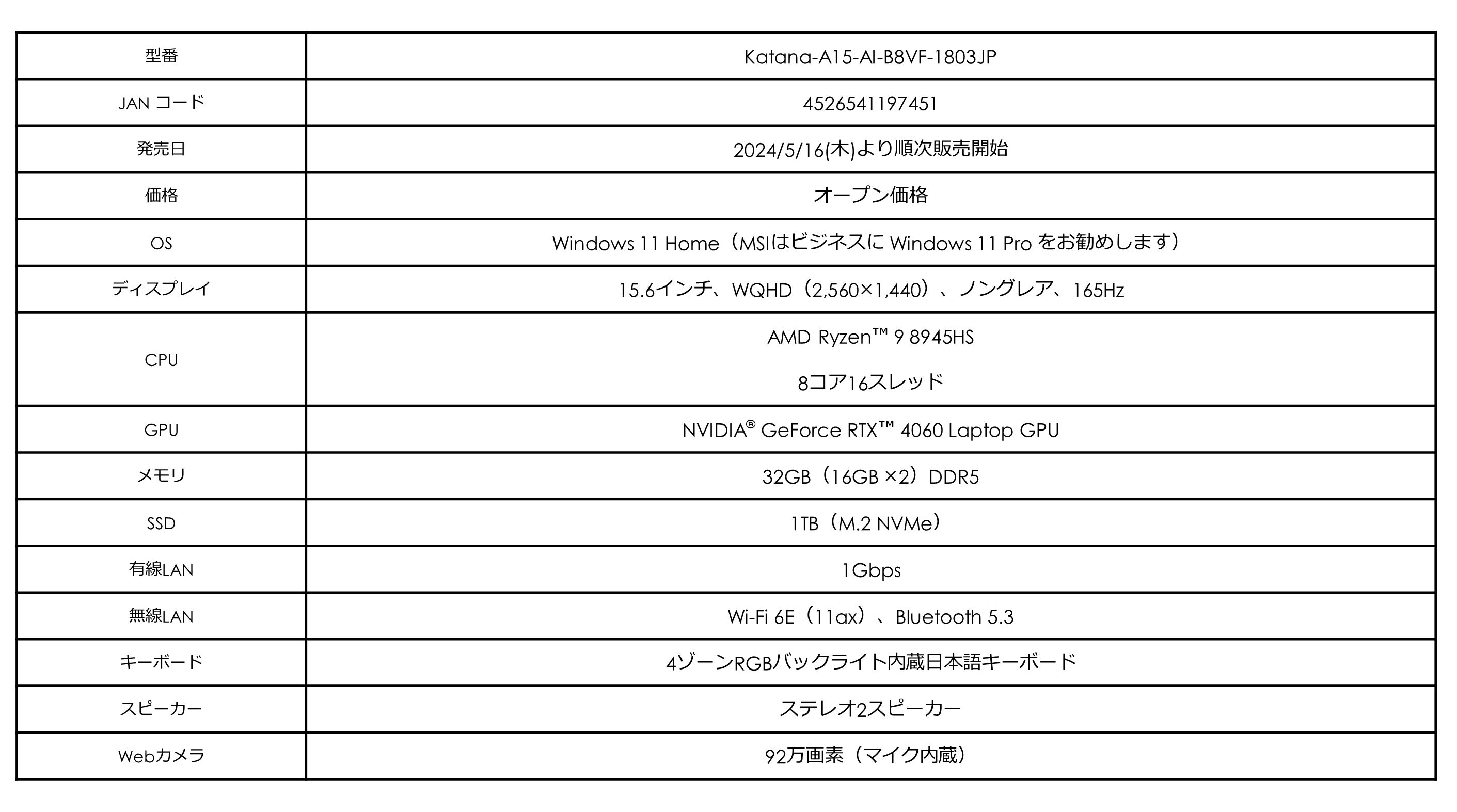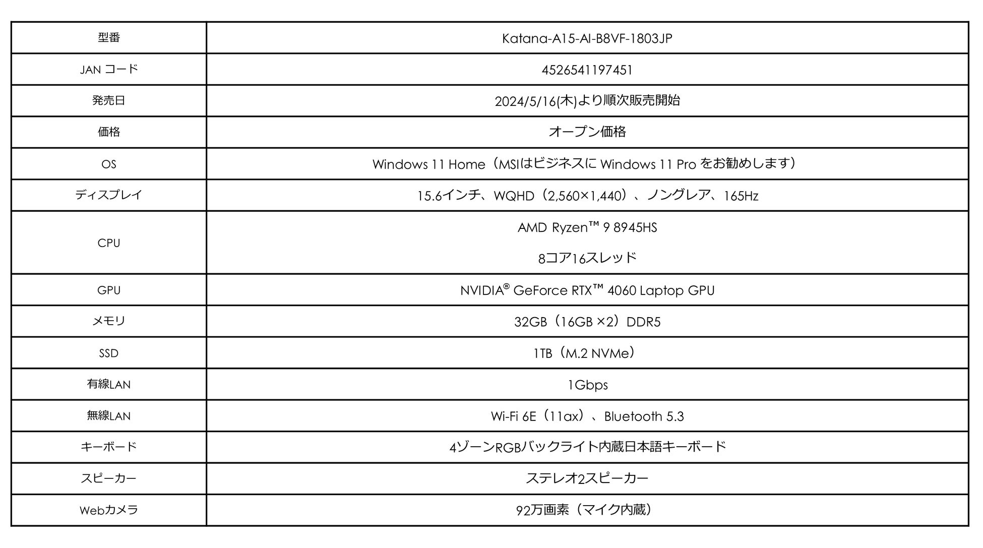 ・Katana A15 AI B8V シリーズ製品ページ:https://jp.msi.com/Laptop/Katana-A15-AI-B8VX