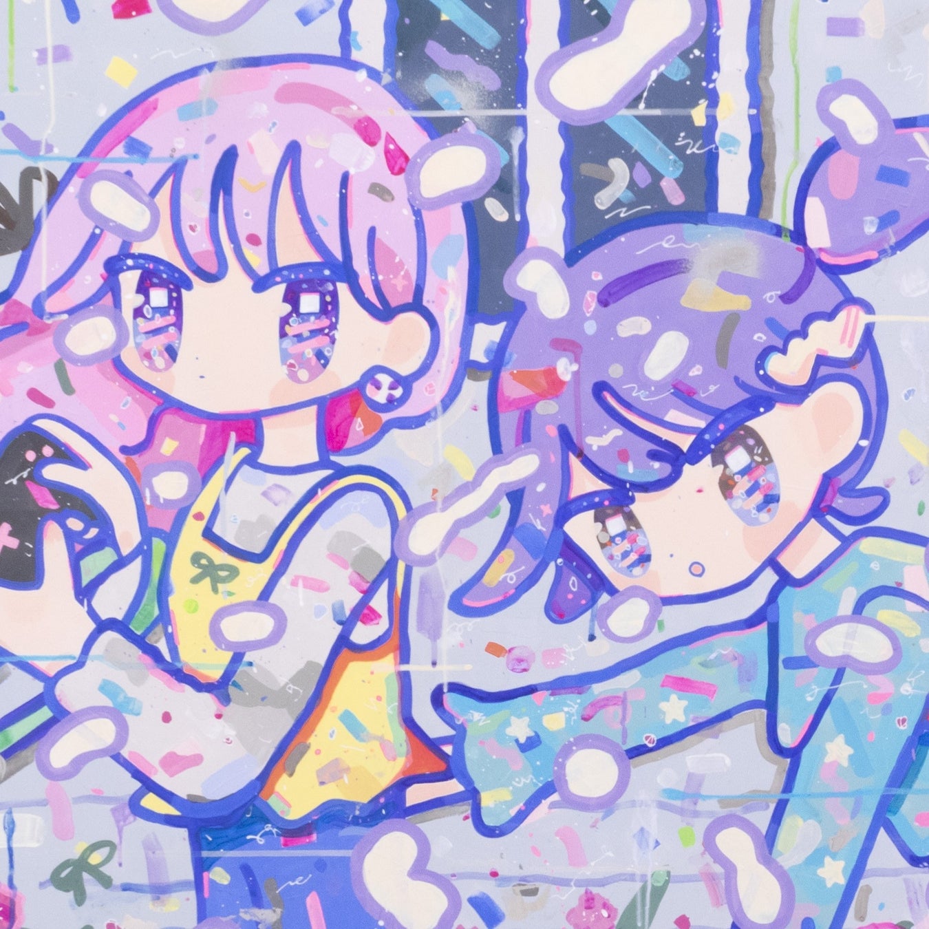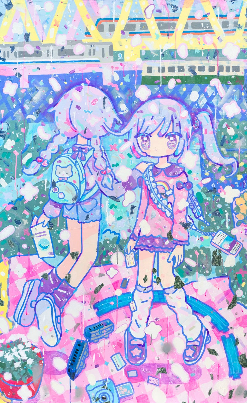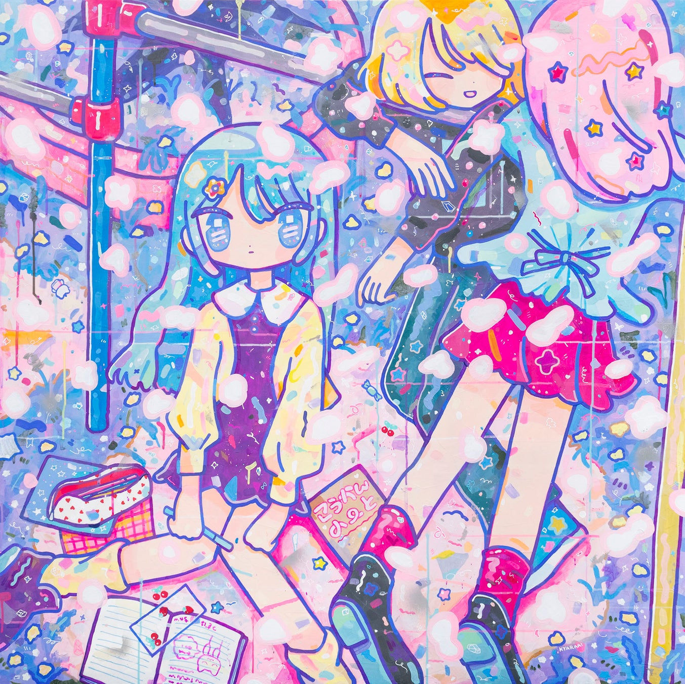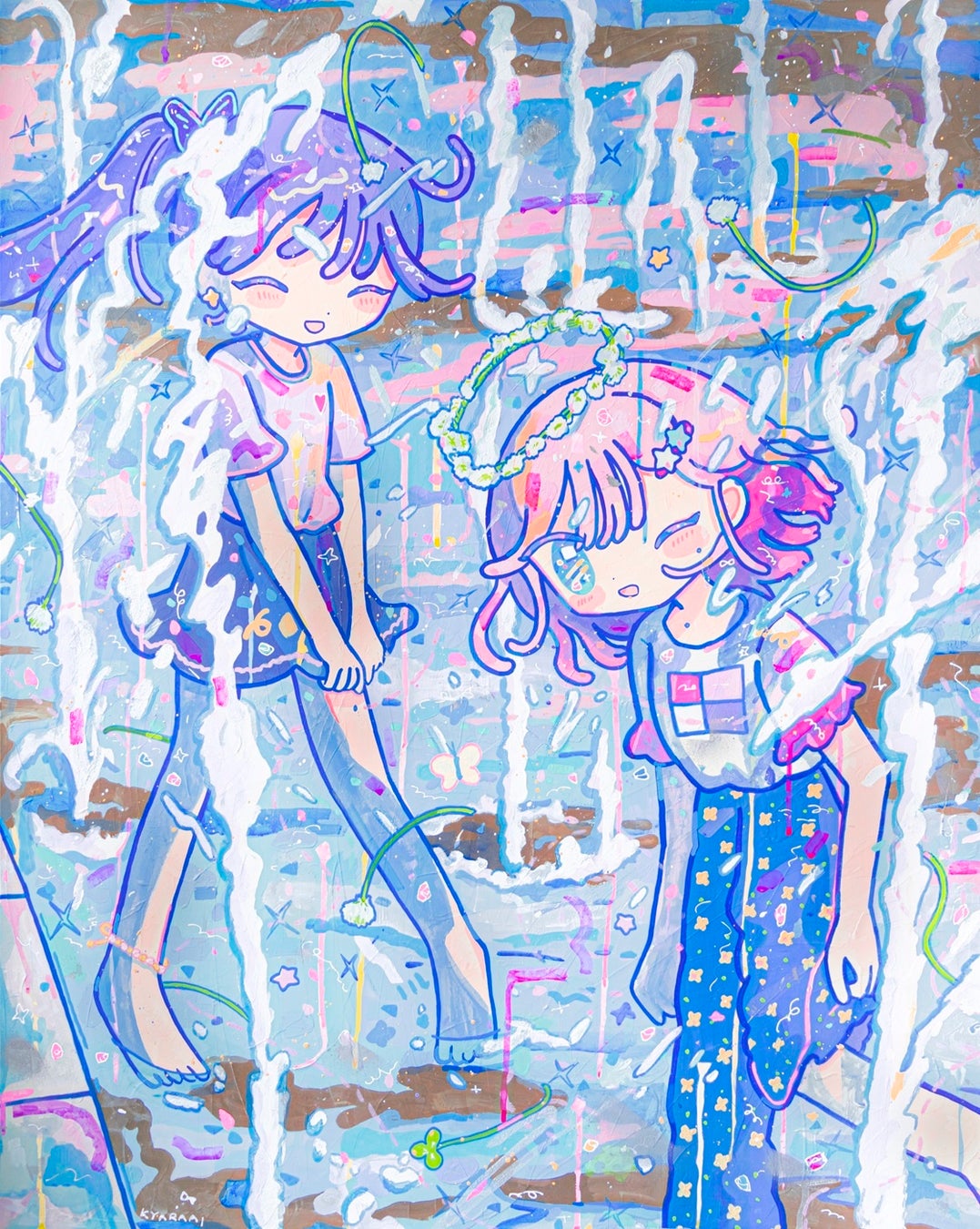 きゃらあいは、幼少期に読んでいた少女漫画から影響を受けた大きな瞳の少女と、パステルカラーを多用したファンシーな作風を特徴とするアーティストです。10代前半にイラストレーターとして活動を始め、SNSを通して若者を中心に多くの注目を集めてきました。現在は、日常的に繰り返し触れるSNS上で生じる幸せと苦しみや、それに伴う自身の不安定さを「ゆらぎ」として制作のテーマに据え、善悪・明暗などで分けることのできない複雑な現代社会や人間関係を描こうとしています。かつてリアルを一所懸命に生きていた時に身近にあったファンシー雑貨などが、インターネットで浮遊しつづける自分の心を留めてくれるような気がするという理由から、絵自体が子どものおもちゃのようであることを大事に制作を続けています。