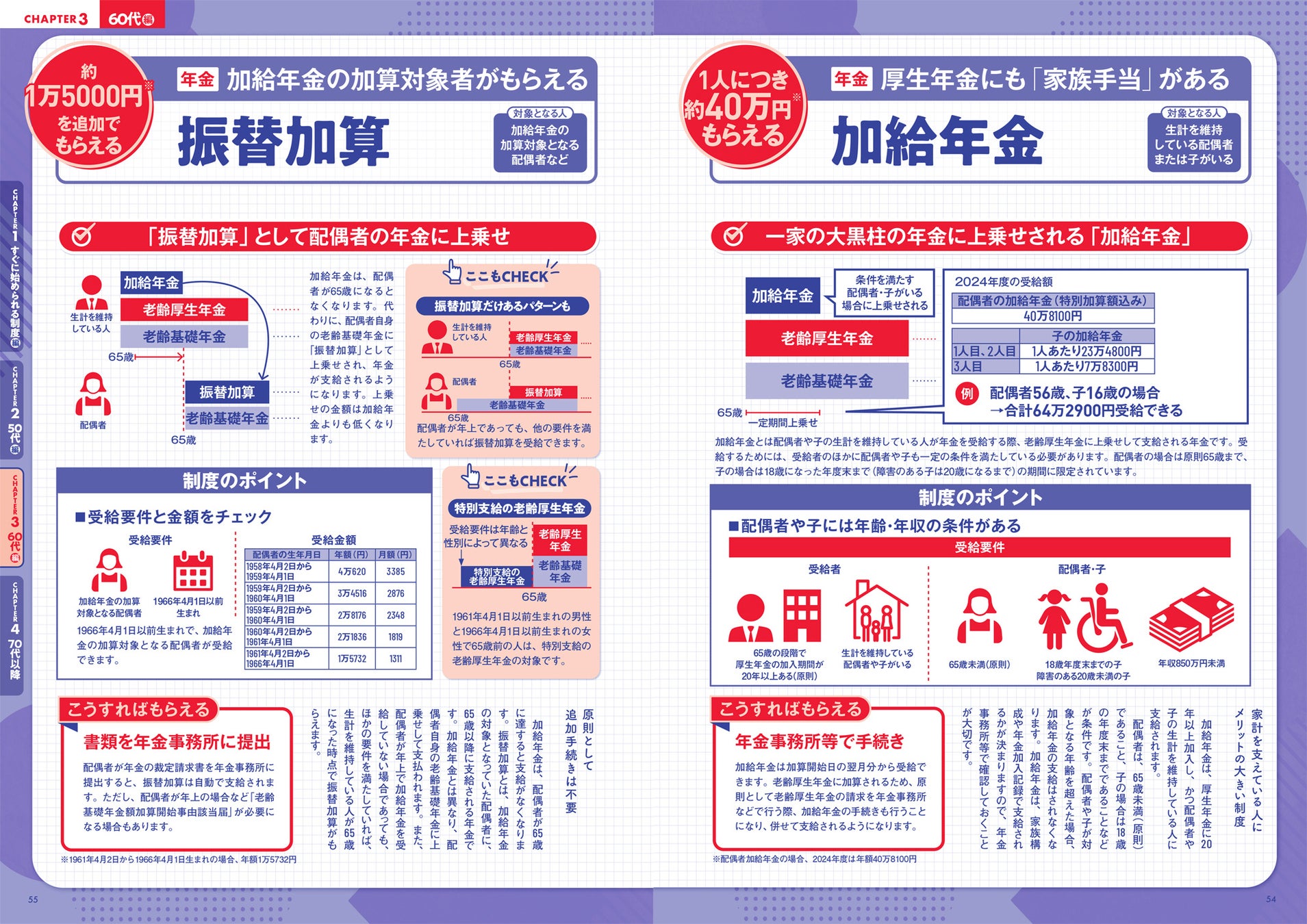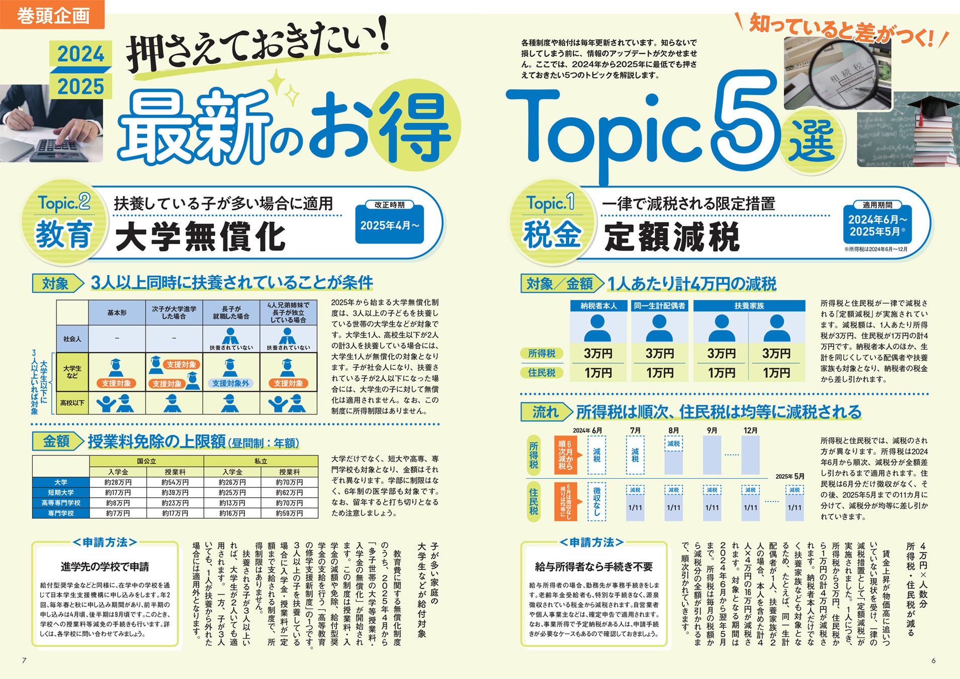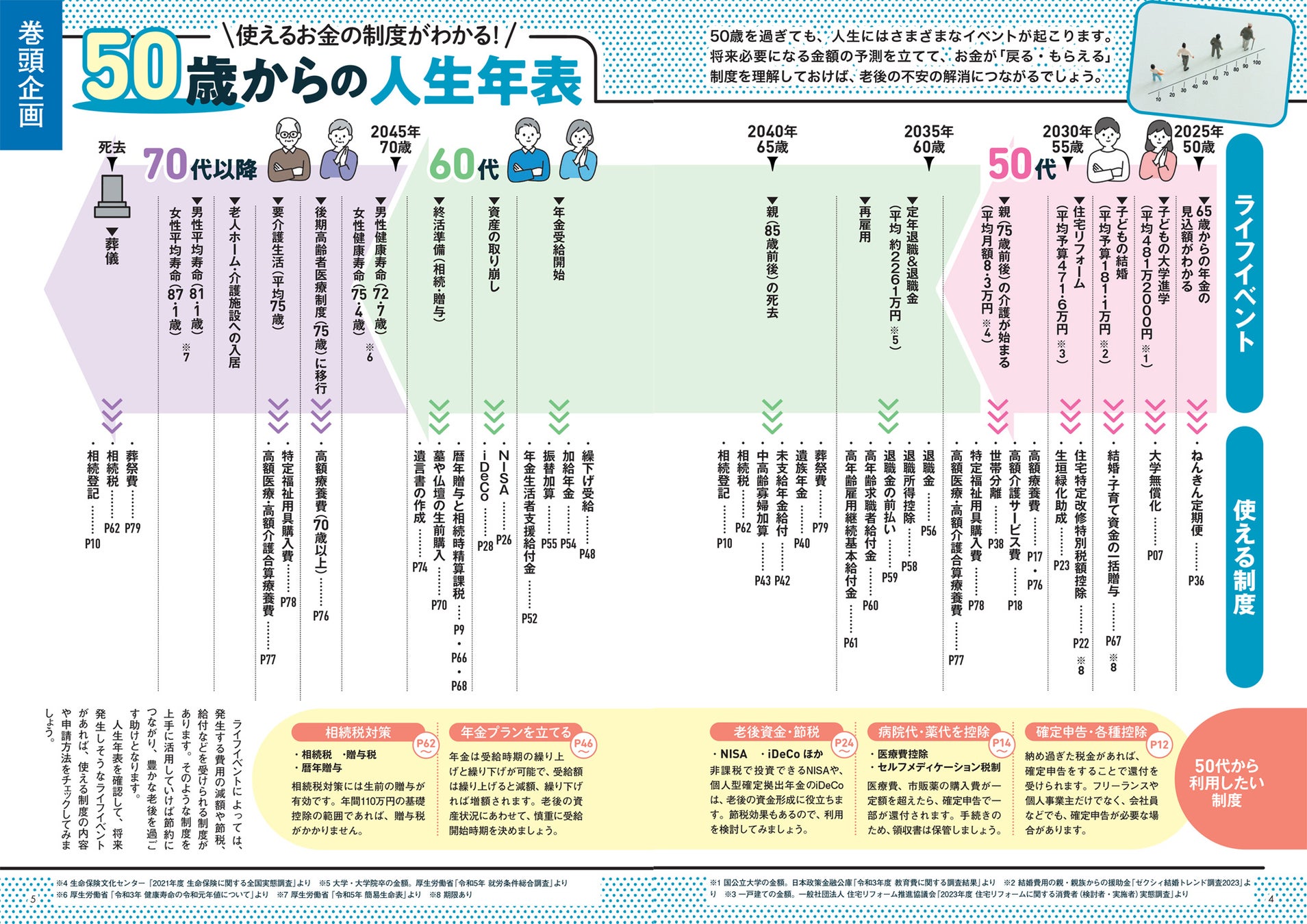 巻頭特集では、2024-2025年の知っておくべき最新ニュースのほかに、これからのライフイベントで使えるお金の制度が一目でわかる「50歳からの人生年表」を掲載。あなただけでなく親の年齢も合わせて確認して、使える制度や給付金の取りこぼしを防きます。