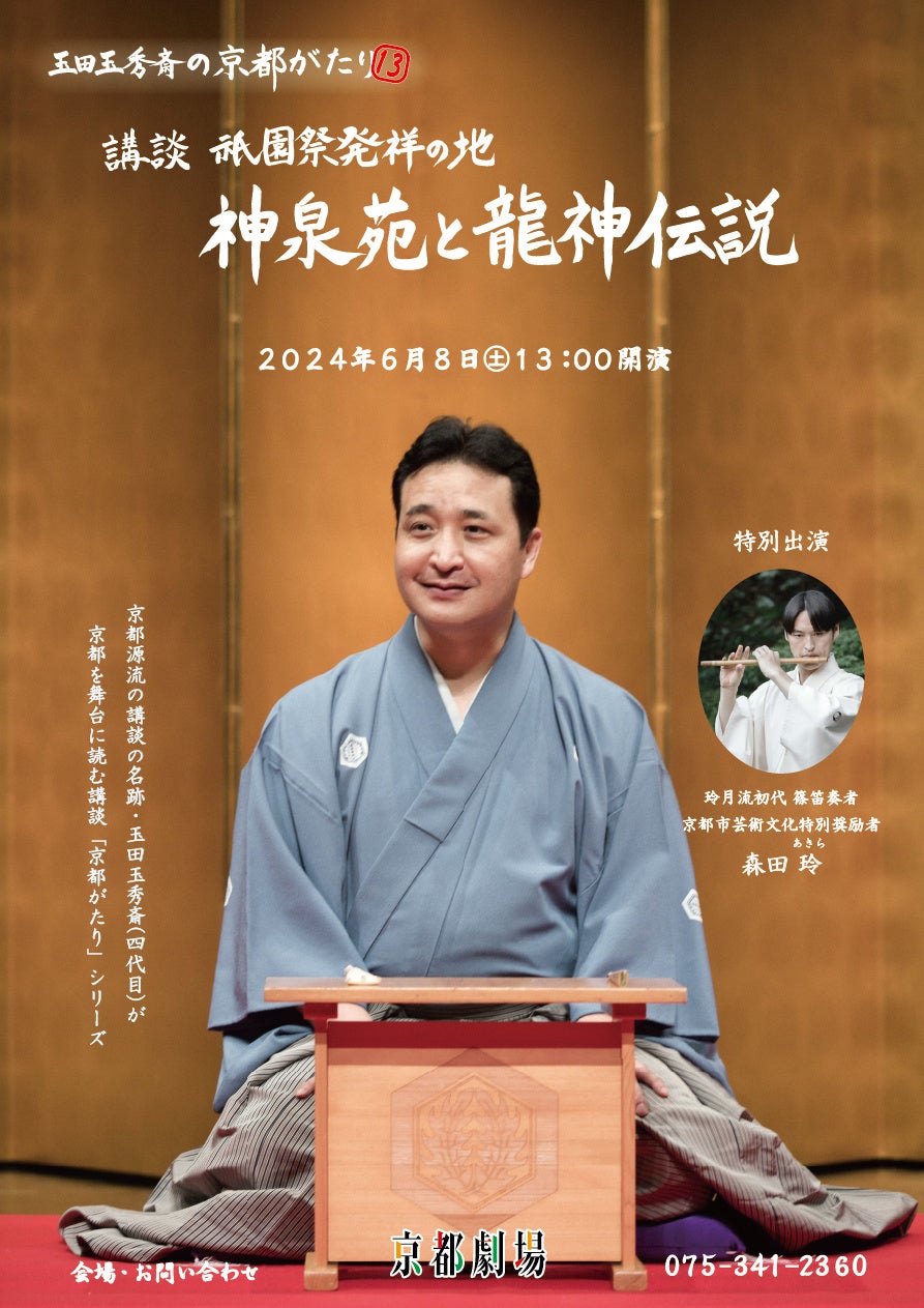 6月に開催いたします第13回は、京の夏の風物詩 “祇園祭”の発祥の地である「神泉苑」を取り上げます。そこに残る龍にまつわる伝説と祇園祭の起源となった物語とは――玉田玉秀斎がまるで「見てきたように」語ります。また、今回は京都を拠点に活躍される玲月流初代 篠笛奏者、森田玲氏の演奏との特別コラボレーションでお届けします。