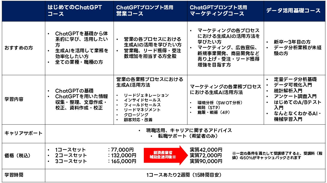 「LINEヤフーテックアカデミー」は経済産業省の「リスキリングを通じたキャリアアップ支援事業」(※5)に採択されており、企業と契約して就労している受講者(正社員、パート・アルバイト、契約社員、派遣社員)が「はじめてのChatGPTコース」を修了した場合、補助金の支援対象となり受講料の50%がキャッシュバックされ、実質的に42,000円で受講することができます。今回開設した「はじめてのChatGPTコース」、「ChatGPTプロンプト活用 営業コース」、「ChatGPTプロンプト活用 マーケティングコース」、「データ活用基礎コース」の4コースから、複数のコースを受講すると受講料が割引価格となり(3コースを受講した場合は66,000円割引)、さらに補助金が適用されると受講料の50%がキャッシュバックされるため、2コース72,000円、3コース90,000円で受講することが可能となります。