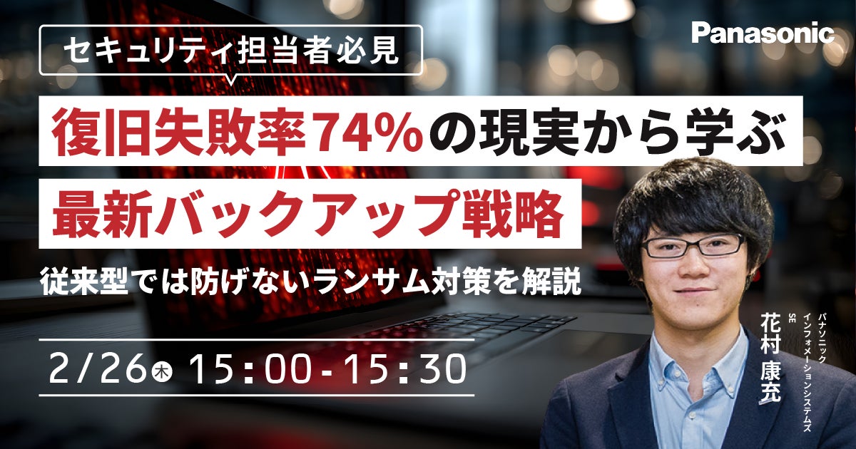 パナソニック インフォメーションシステムズ株式会社は、2026年2月26日(木)『【セキュリティ担当者必見】復旧失敗率74%の現実から学ぶ最新バックアップ戦略~従来型では防げないランサム対策を解説~』セミナーを開催します。