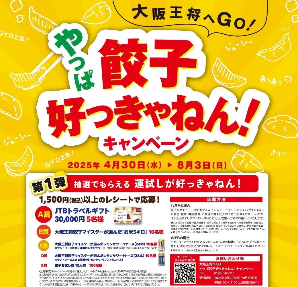 内容:餃子を含む1.500円以上のお買い上げレシートで、ご希望の賞品へご応募いただけるキャンペーン。抽選で、JTBトラベルギフト30,000円分のほか、大阪王将餃子マイスターが選んだお米やレモンサワーなど合計135名様に当たります。