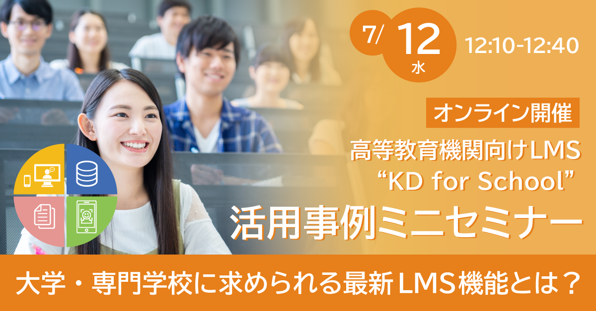高等教育機関向けLMSをご紹介!大学・専門学校に求められる最新LMS機能とは? “KD for School”活用事例ミニセミナー《6/20(火)・7/12(水)昼 オンライン開催》