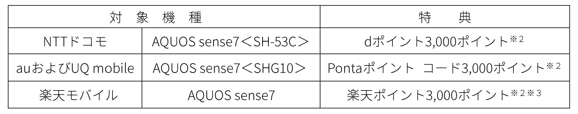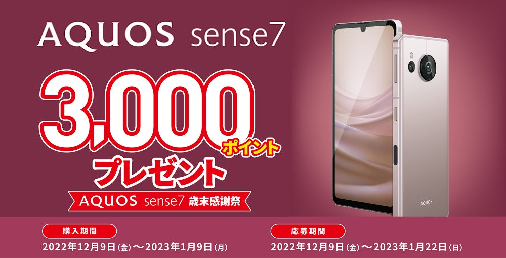 期間中(2022年12月9日(金)~2023年1月9日(月))に対象の「AQUOS sense7」(NTTドコモ/auおよびUQ mobile/楽天モバイル)をご購入の上、専用サイトからご応募いただいたお客様全員に、3,000ポイント(dポイント/Pontaポイント/楽天ポイントのいずれか)をプレゼントします。