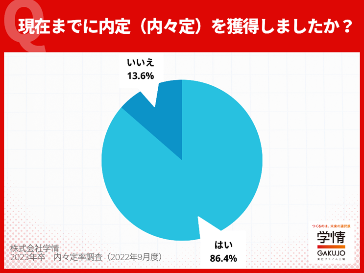 株式会社学情(本社:東京都千代田区)は、2023年3月卒業(修了)予定の大学生・大学院生を対象に、就職活動に関するインターネットアンケートを実施。今回は、「内々定の獲得状況」をテーマに調査しました。2022年8月末時点の内々定獲得率は、86.4%。前月から5.4ポイント増加しており、10月1日の内定式を前に内々定出しが 加速していると言えそうです。