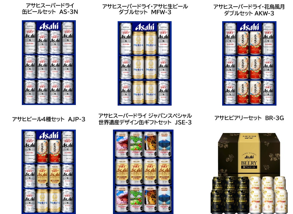 本年の歳暮ギフトセットは、1987年の発売以来36年目で初めてフルリニューアルした『アサヒスーパードライ』、ギフト限定商品として好評をいただいている国産原料100%の『アサヒスーパードライ ジャパンスペシャル』に加え、東北6県限定で販売しているプレミアムビール『花鳥風月』をギフトセットのみ全国発売します。“マルエフ”の愛称で親しまれる『アサヒ生ビール』やアルコール分0.5%の“微アルコール”ビールテイスト飲料『アサヒ ビアリー』のギフトでの発売を通じて、お客さまの選択肢の拡大を図ります。