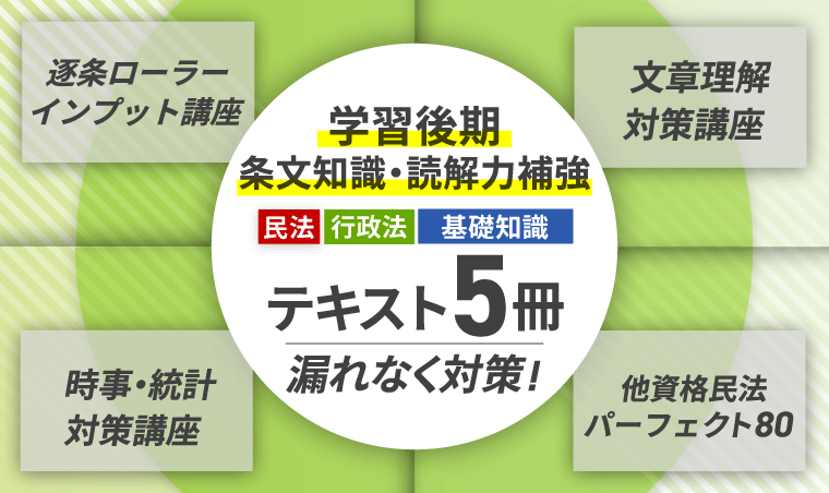 「逐条ローラーインプット講座」では行政法と民法の条文に沿って復習し、「他資格民法パーフェクト80」では不足しがちな民法をさらに対策します。