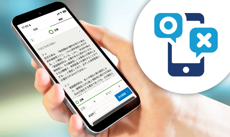 「オンライン演習サービスTOKERUKUN」では、お手持ちのスマートフォンで択一式試験の過去問を繰り返し解くことができます。 場所を選ばずに学習できるので、移動中などの隙間時間で択一式の解答力を磨くことができます。