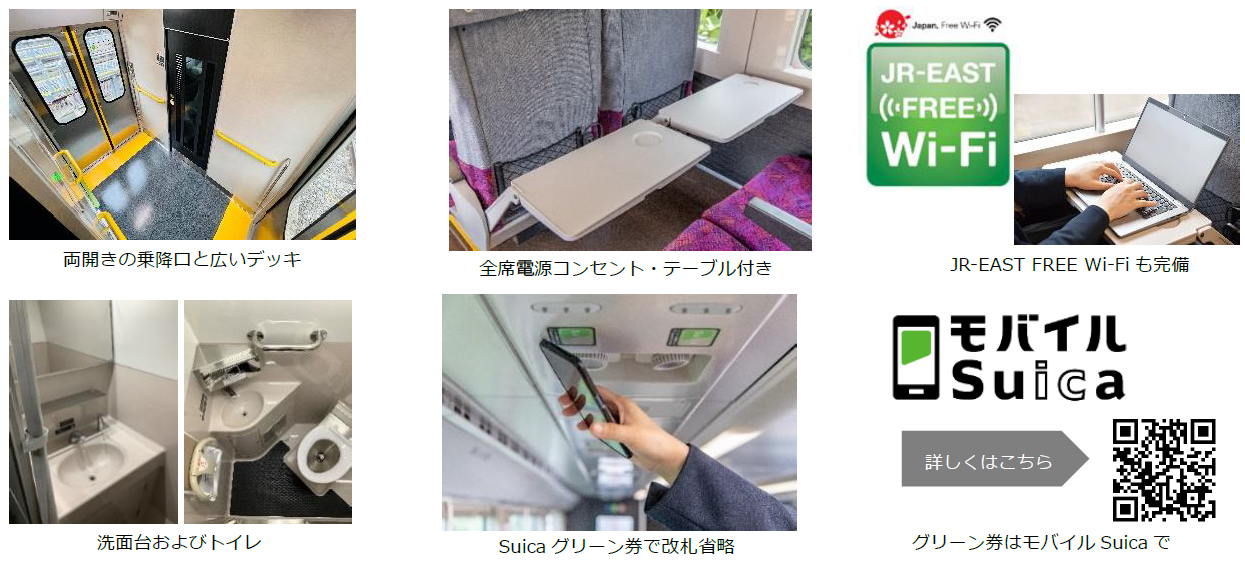 〇座席は快適な回転式リクライニングシートで、全席に電源コンセント・テーブル・ドリンクホルダーを備えています。また、車内ではJR-EAST FREE Wi-Fi、トイレ、ゴミ箱等もご利用いただけるほか、「グリーンアテンダント」がグリーン車に乗務し、ご案内等のサービスを実施する予定です。